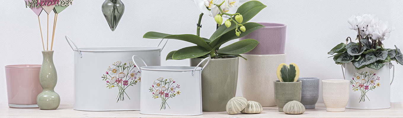 Bei Opiflor finden Sie eine breite Palette an Gefäßen für Ihre kreative, floristische Arbeit. Entdecken Sie Gefäße aus Keramik, Metall, Holz, Weide, Zink oder Glas, die als dekorativer Blickfang und Ergänzung für Ihre Pflanzen und Blumenarrangements dienen.