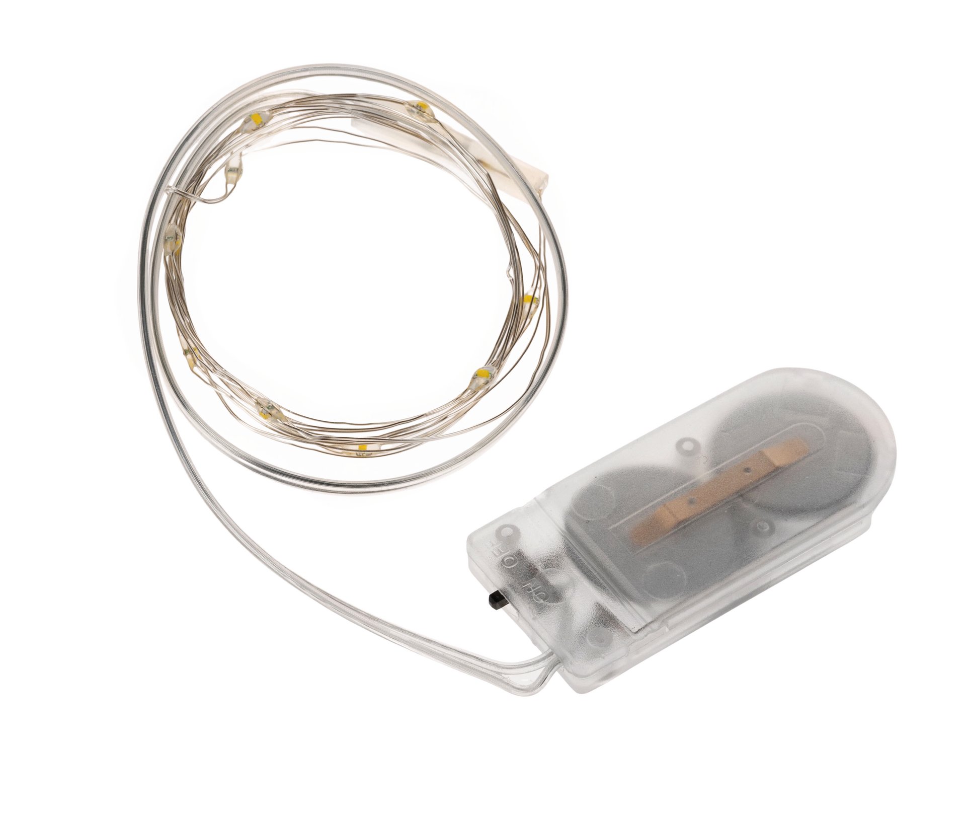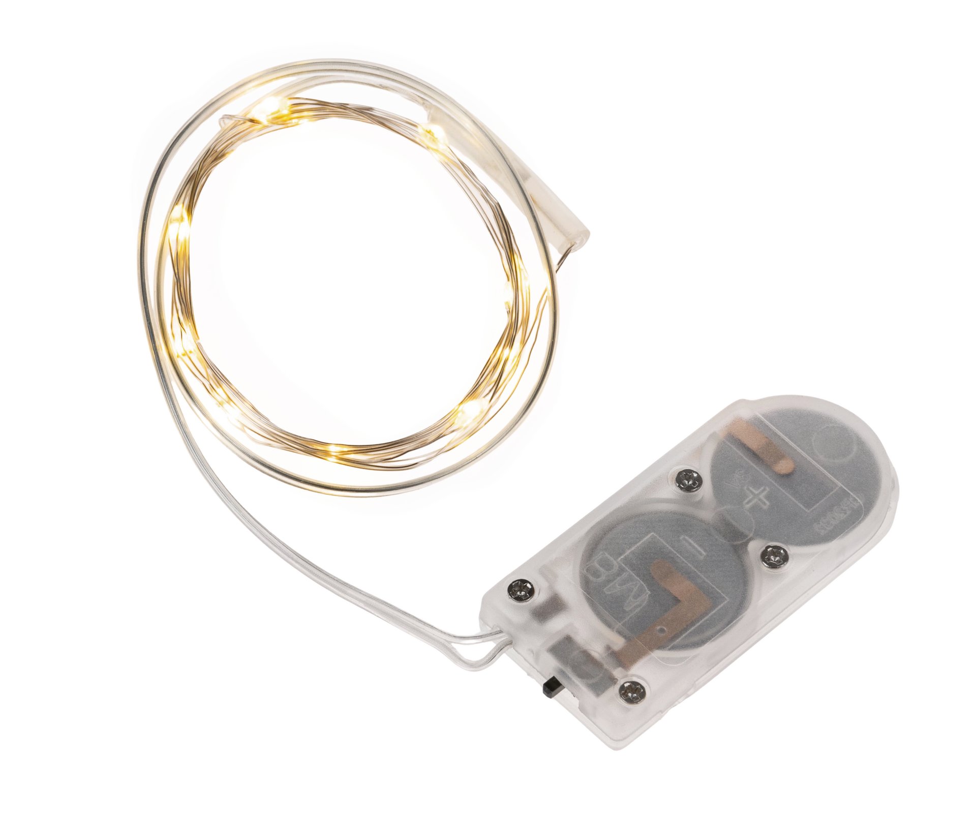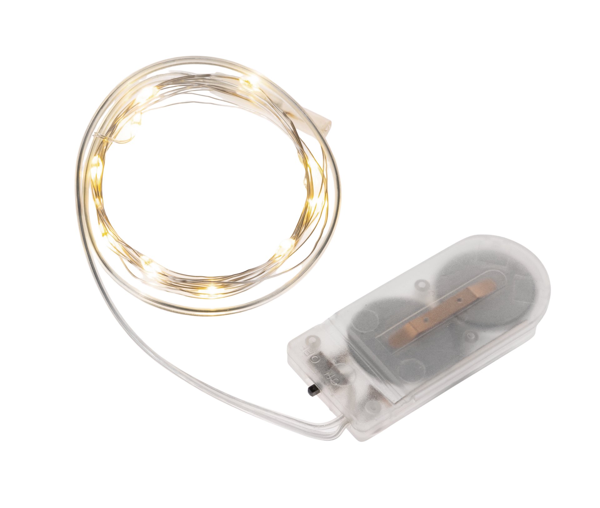 Microlichterkette mit 10 LED-Lämpchen in warm-weiß. Für den Innenbereich. Batterien 2 x AA 1,5 V inklusive. Batteriegehäuse transparent.