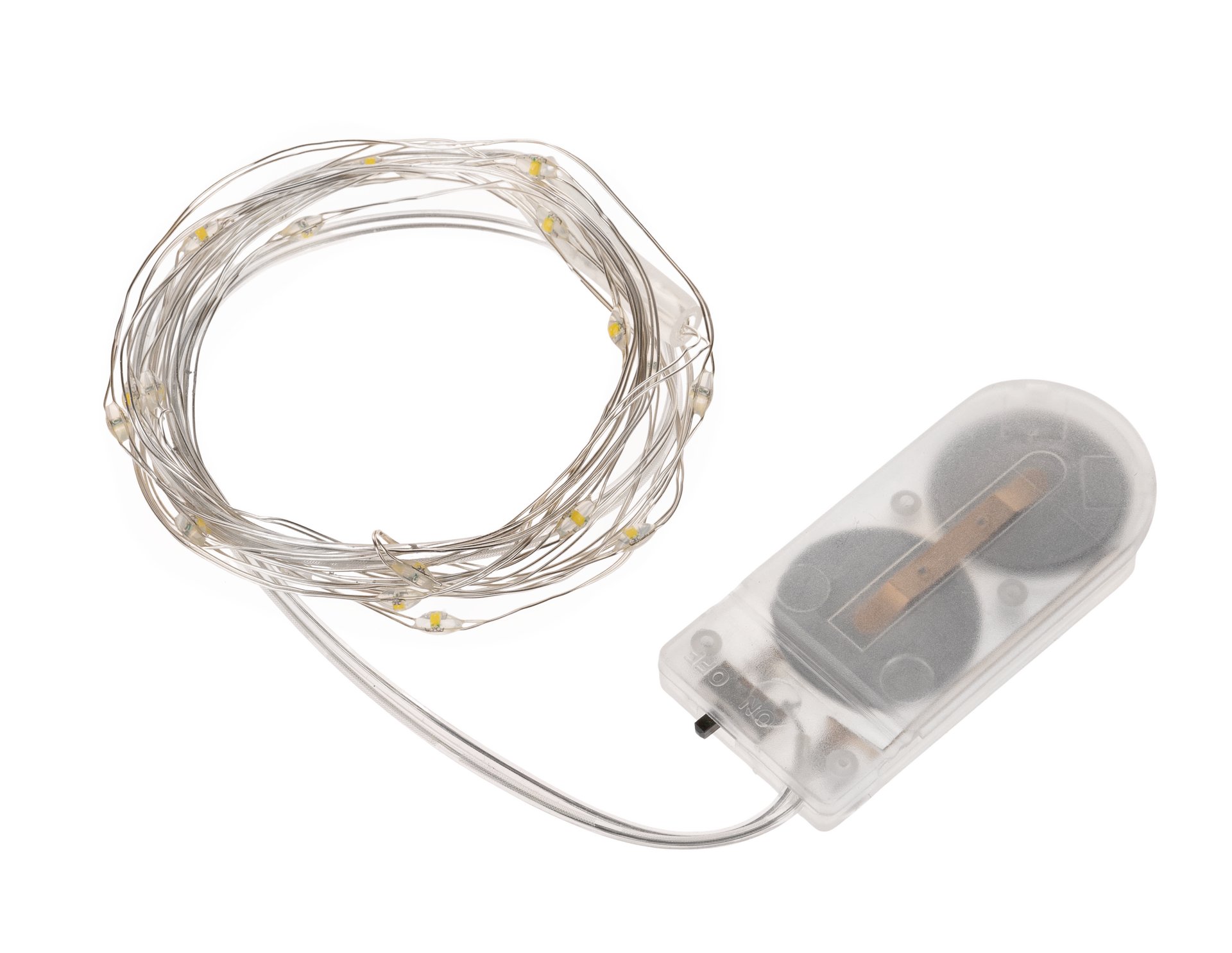 Microlichterkette mit 10 LED-Lämpchen in warm-weiß. Für den Innenbereich. Batterien 2 x AA 1,5 V inklusive. Batteriegehäuse transparent.
