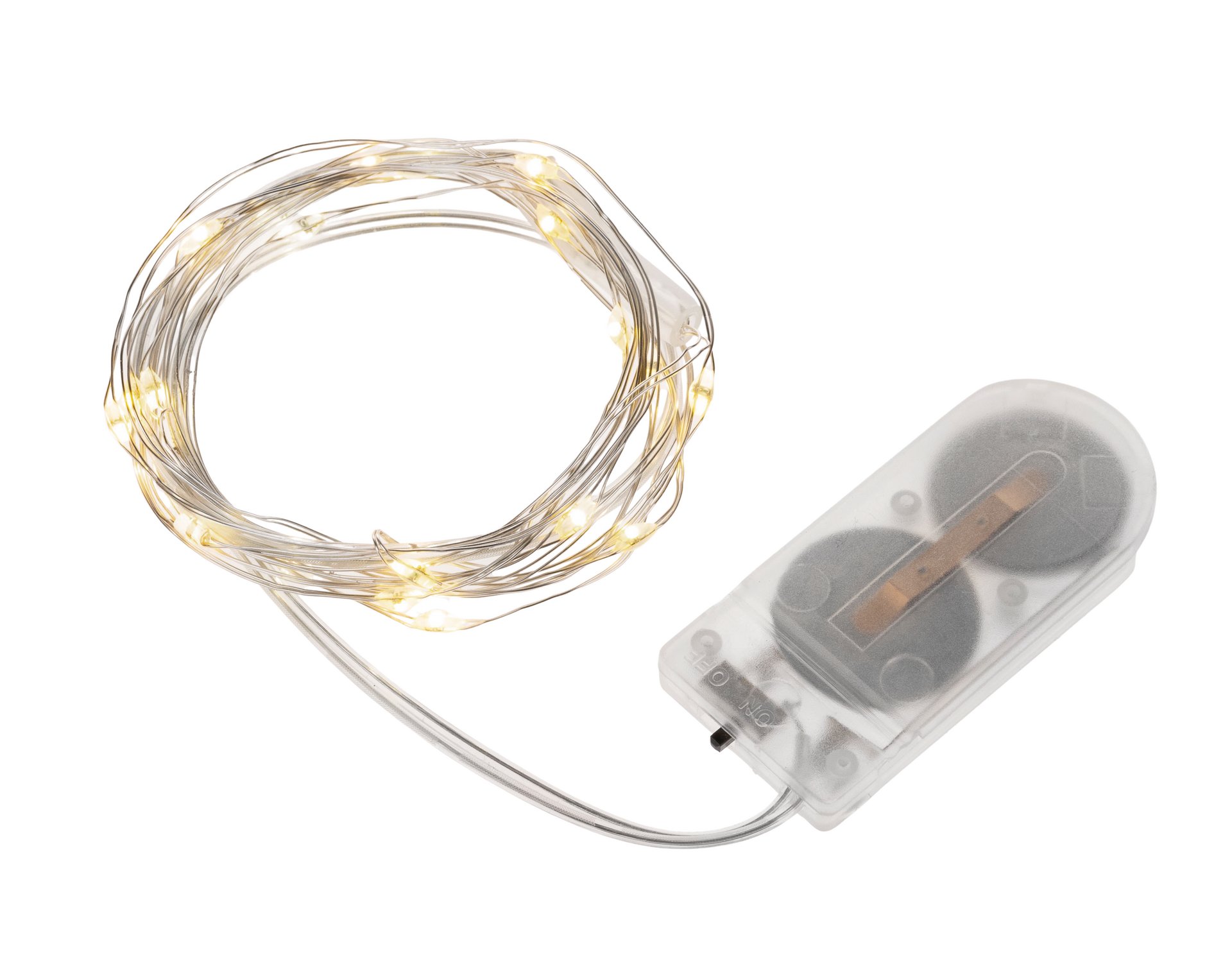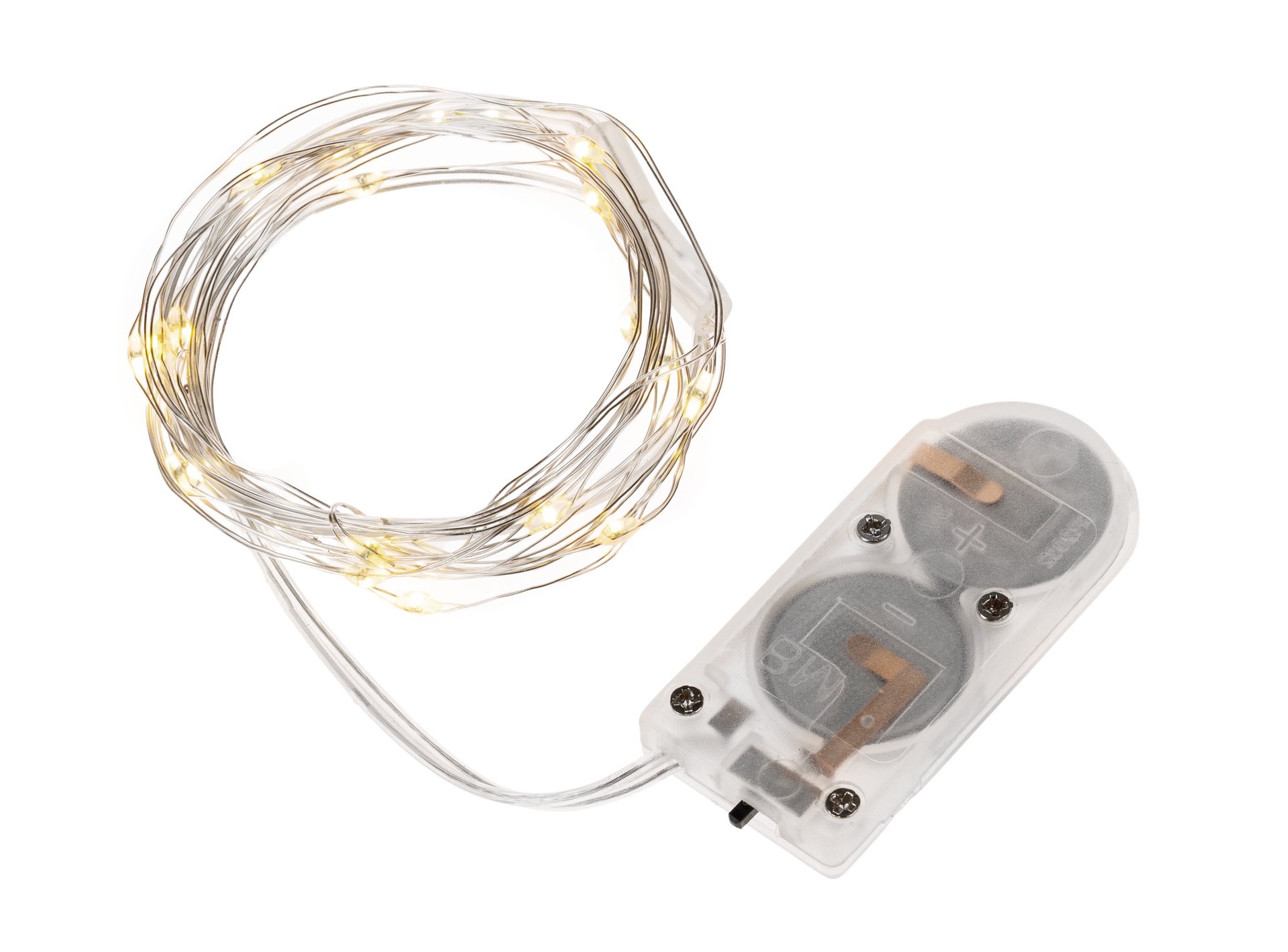 Microlichterkette mit 20 LED-Lämpchen in warm-weiß. Für den Innenbereich. Batterien 2 x AA 1,5 V inklusive. Batteriegehäuse transparent.