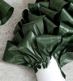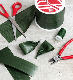 1. Bereiten Sie die Bündel vor, indem Sie das Aspi-Band in etwa 20 cm große Stücke schneiden und diese dann längs halbieren. Legen Sie beide Enden eines zurechtgeschnittenen Stückes aufeinander und raffen Sie diese zusammen. Umwickeln Sie das zusammengeraffte Ende mit dünnem Draht und verzwirbeln Sie ihn.