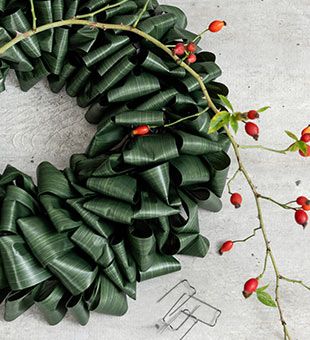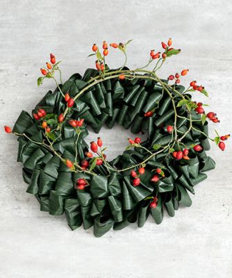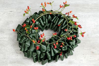 Mit unserem naturgetreuen Aspi-Ban können Sie einen ewig haltbaren Kranz für Ihre Kunden entstehen lassen. Ob für den Herbst, den Winter, Frühling oder Sommer - er kann je nach Jahreszeit zusätzlich individuell gestaltet werden. Für einen herbstlichen Look haben wir uns für Hagebutten entschieden, die mit ihren roten Früchten dem Kranz eine tolle Lebendigkeit verleihen.