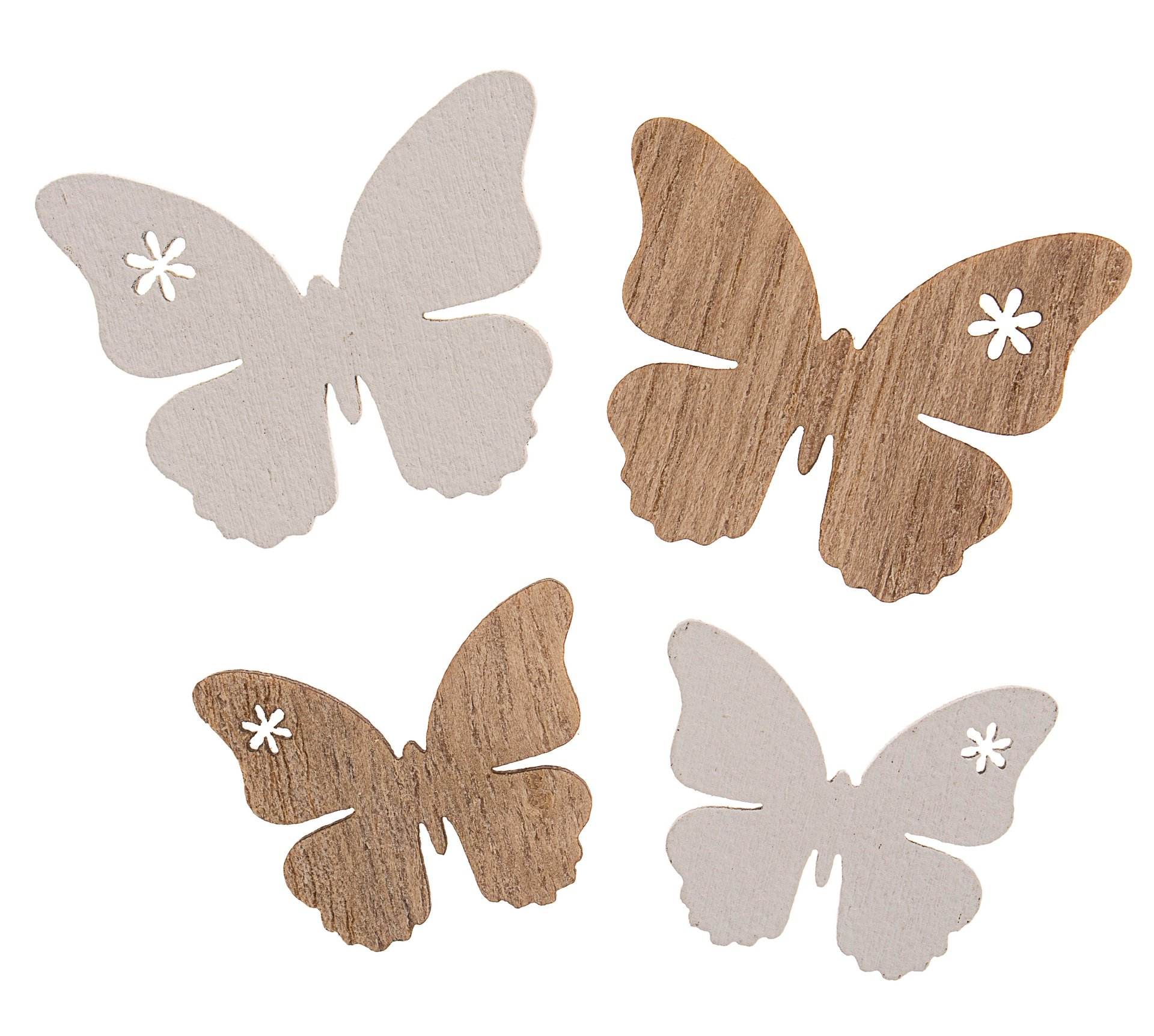 Holzstreuteile in zwei verschiedenen Formen. 2farbig sortiert: weiß und natur. 24 Stück in der Box.