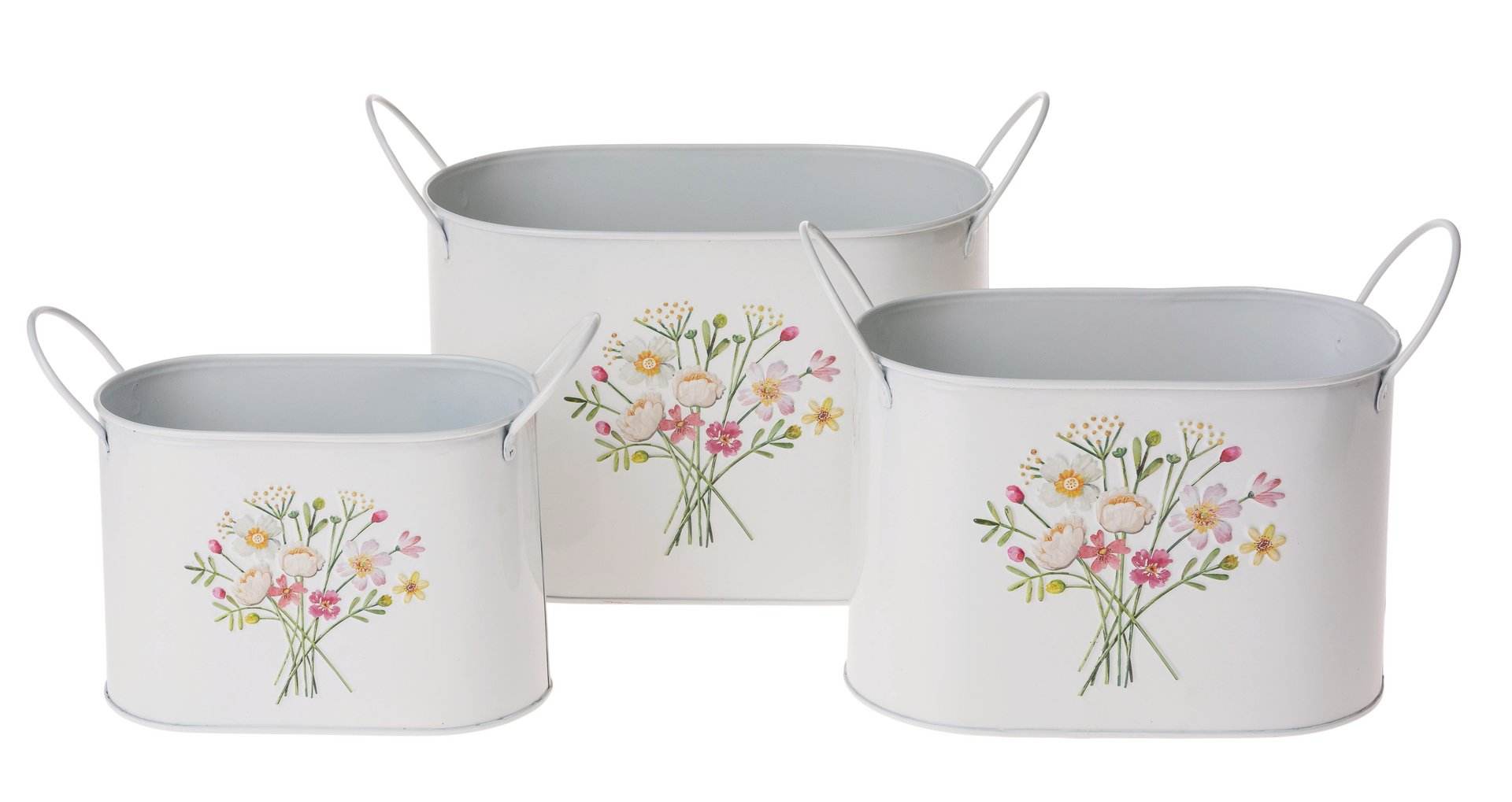 Schale aus Metall mit floralem Motiv auf der Vorderseite. 3er Set. Größen: 16,5 x 9 x 11,5 cm, 20 x 11,5 x 13,5 cm und 23 x 13,5 x 15,5 cm.