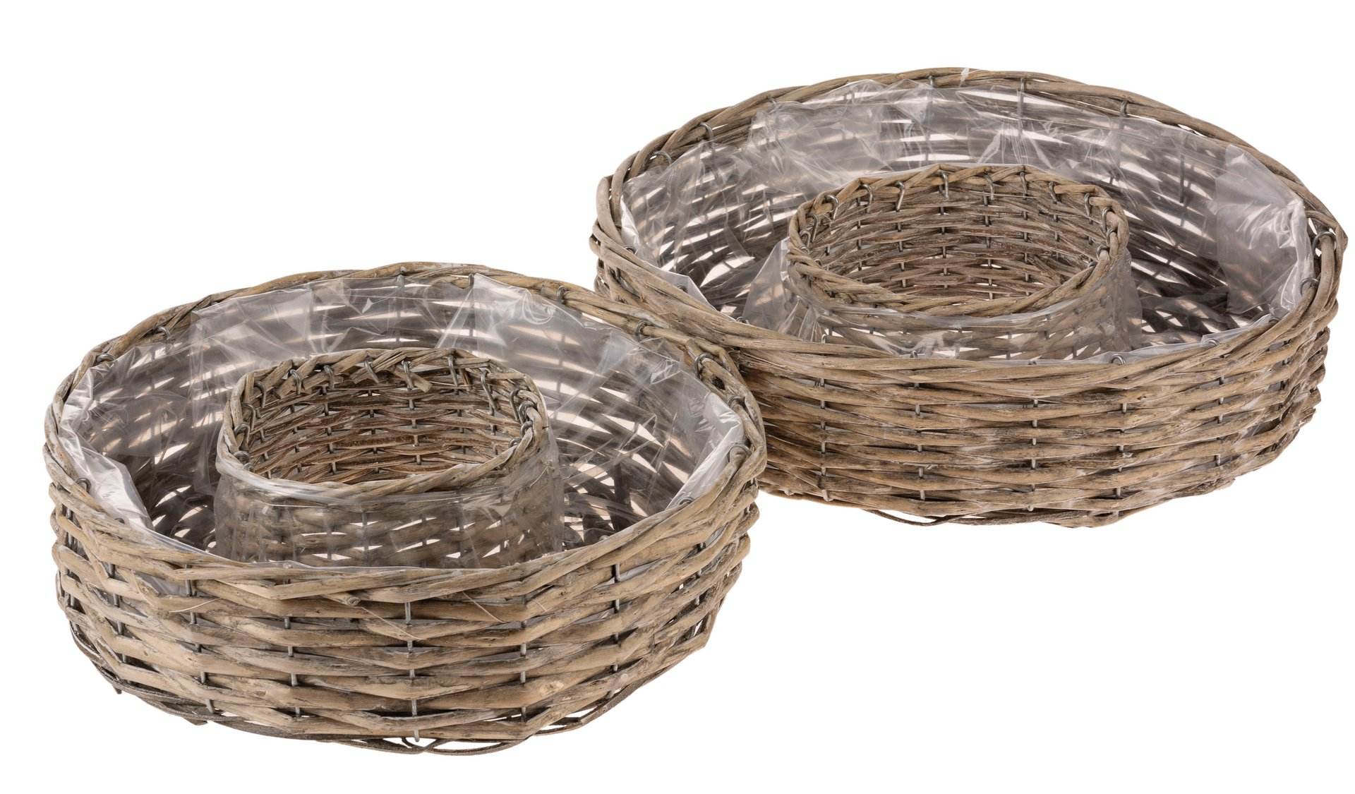 Runder Korb aus grauer gespaltener Weide in weiß gekalkt. Innen foliert. 3er Set.Größen: Ø 15 x 8 cm, Ø 22 x 10 cm, Ø 25 x 12 cm.