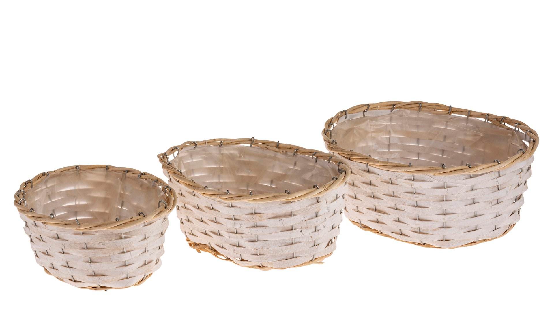 Ovaler Pflanzkorb aus Holzspanstreifen. Innen foliert. 3er Set.Größen: 22 x 14 x 10 cm, 26 x 18 x 11 cm, 30 x 21 x 12 cm.