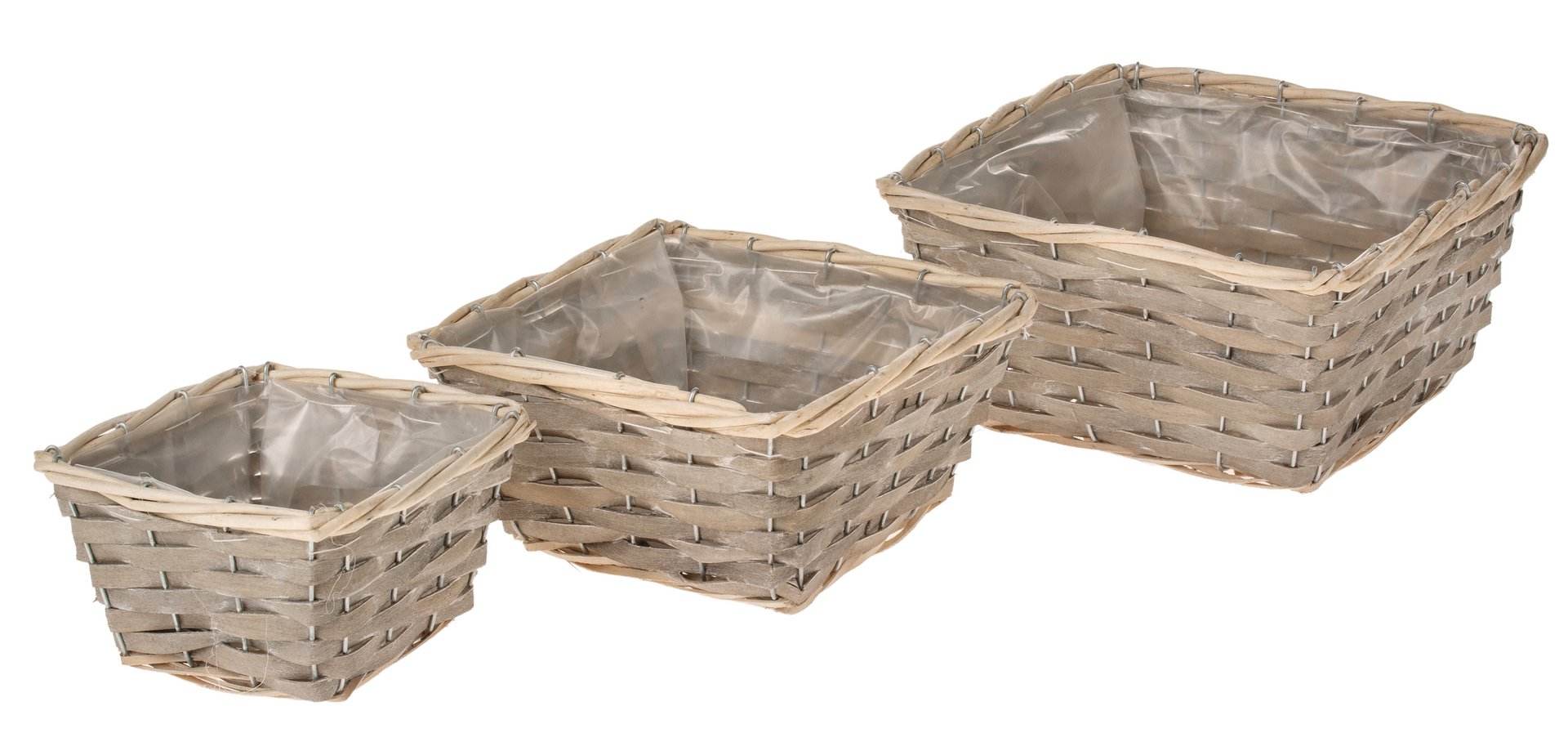 Eckiger Pflanzkorb aus Holzspanstreifen. Innen foliert. 3er Set.Größen: 15 x 15 x 9 cm, 20 x 20 x 10 cm, 23 x 23 x 12cm.