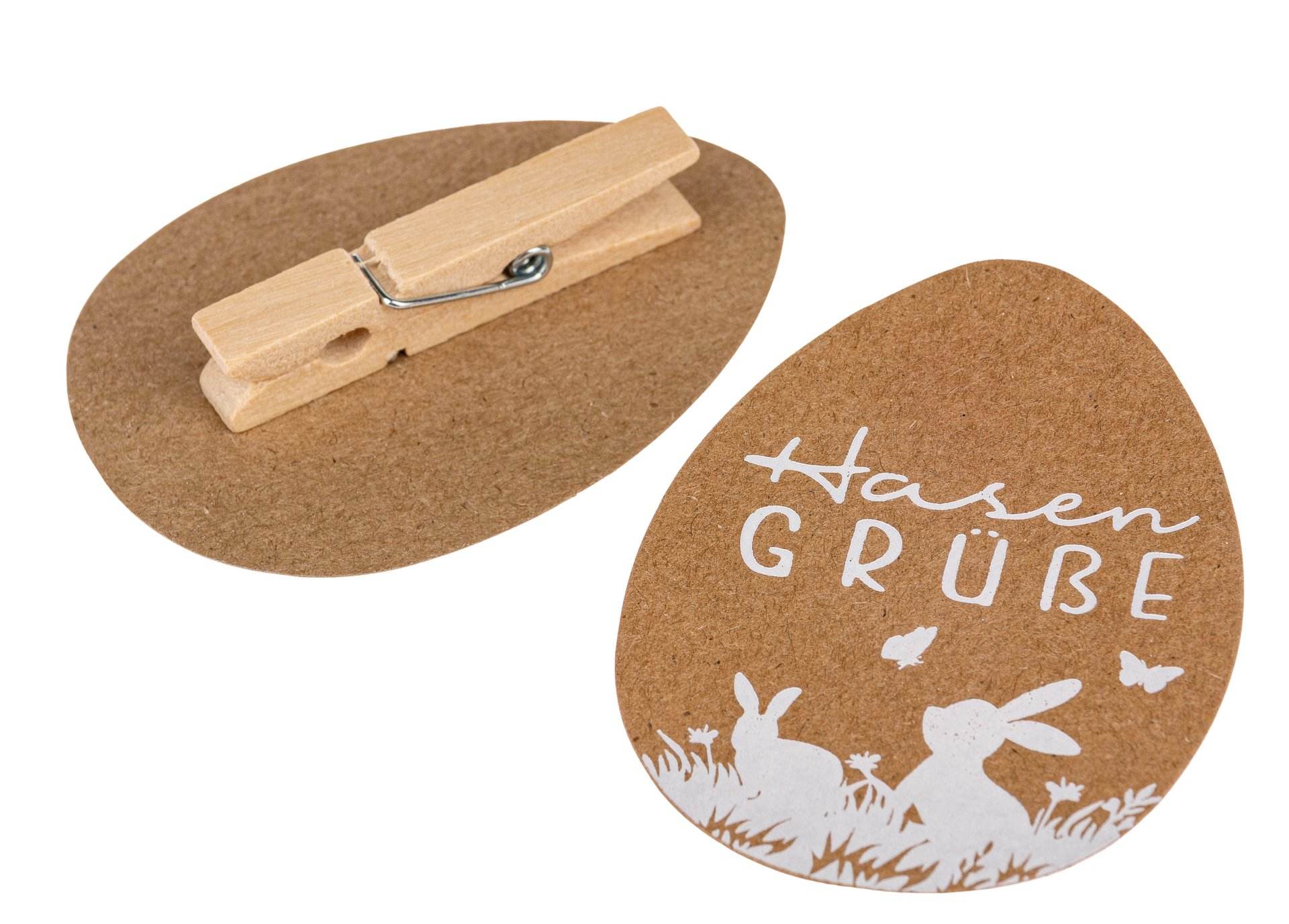 Ei aus Kraftpapier mit Aufdruck "Hasengrüße" und rückseitiger Holzklammer.