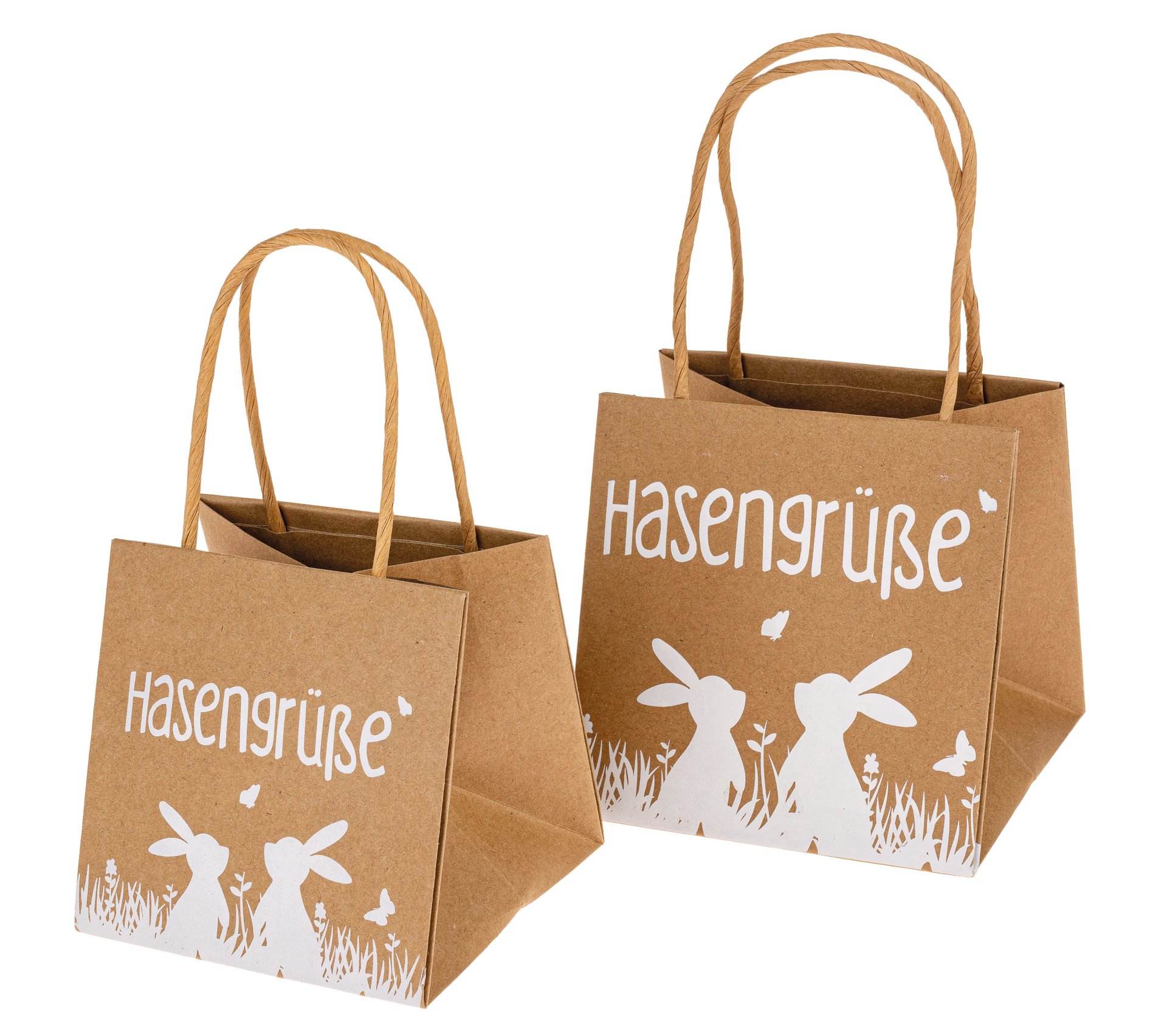 Tasche aus Kraftpapier mit Henkeln, Hasenmotiv und Aufdruck "Hasengrüße". Innen wasserabweisend beschichtet.
