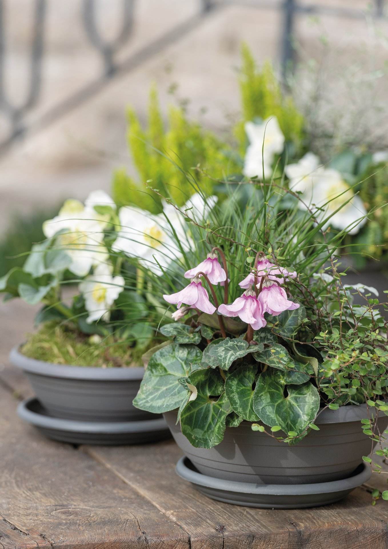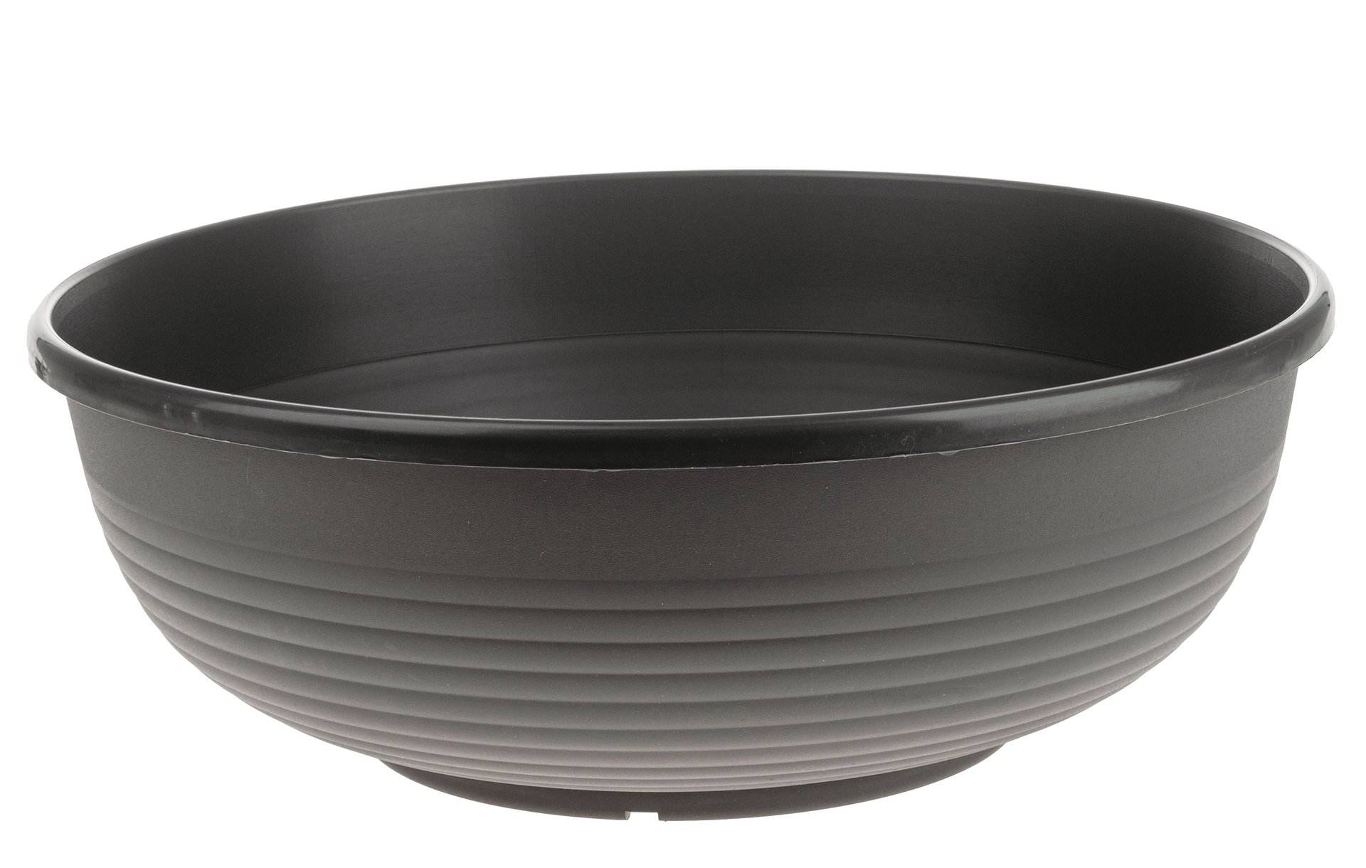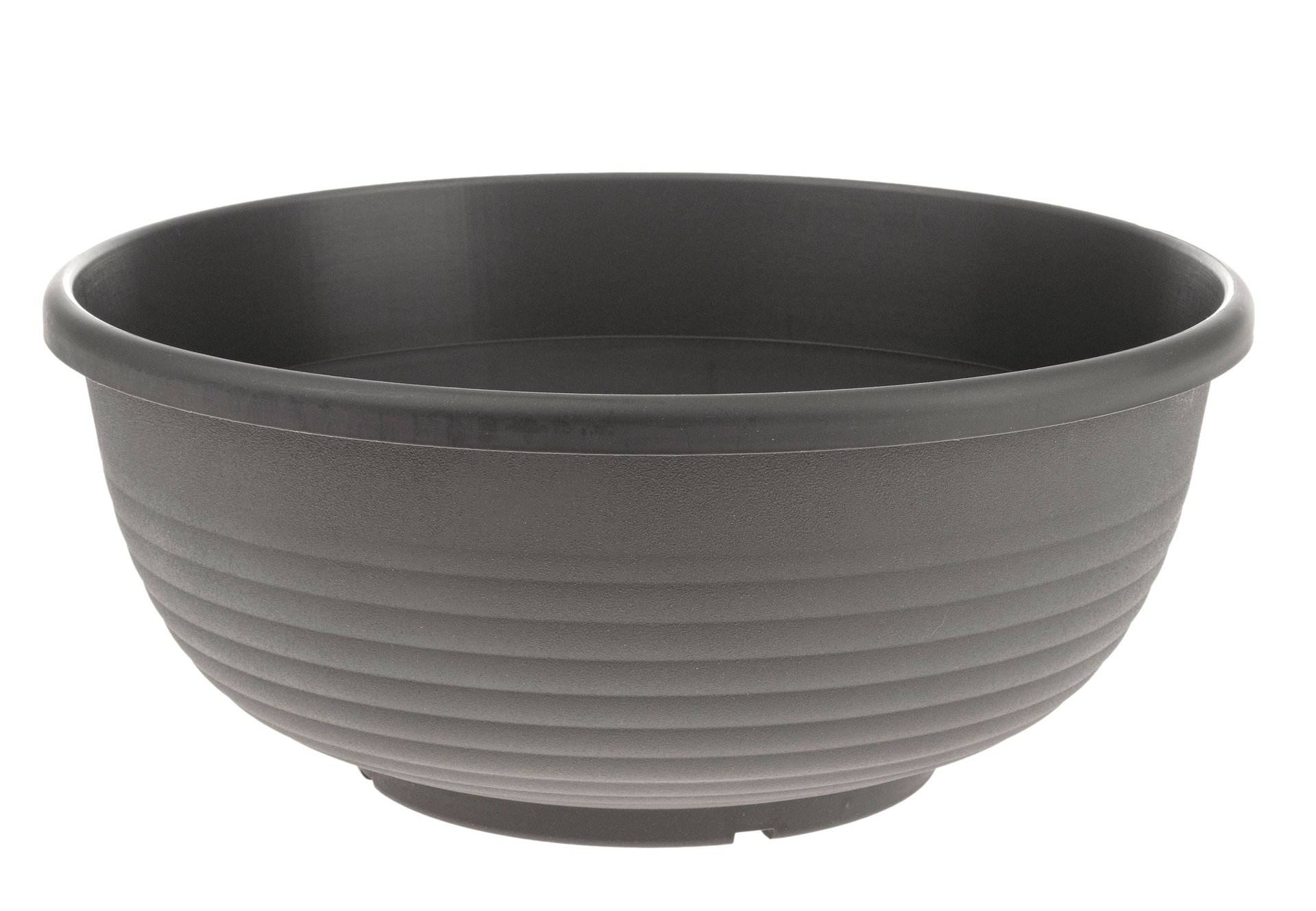 Runde, bauchige Kunststoffpflanzschale mit 4 Bodenlöchern gegen Staunässe.