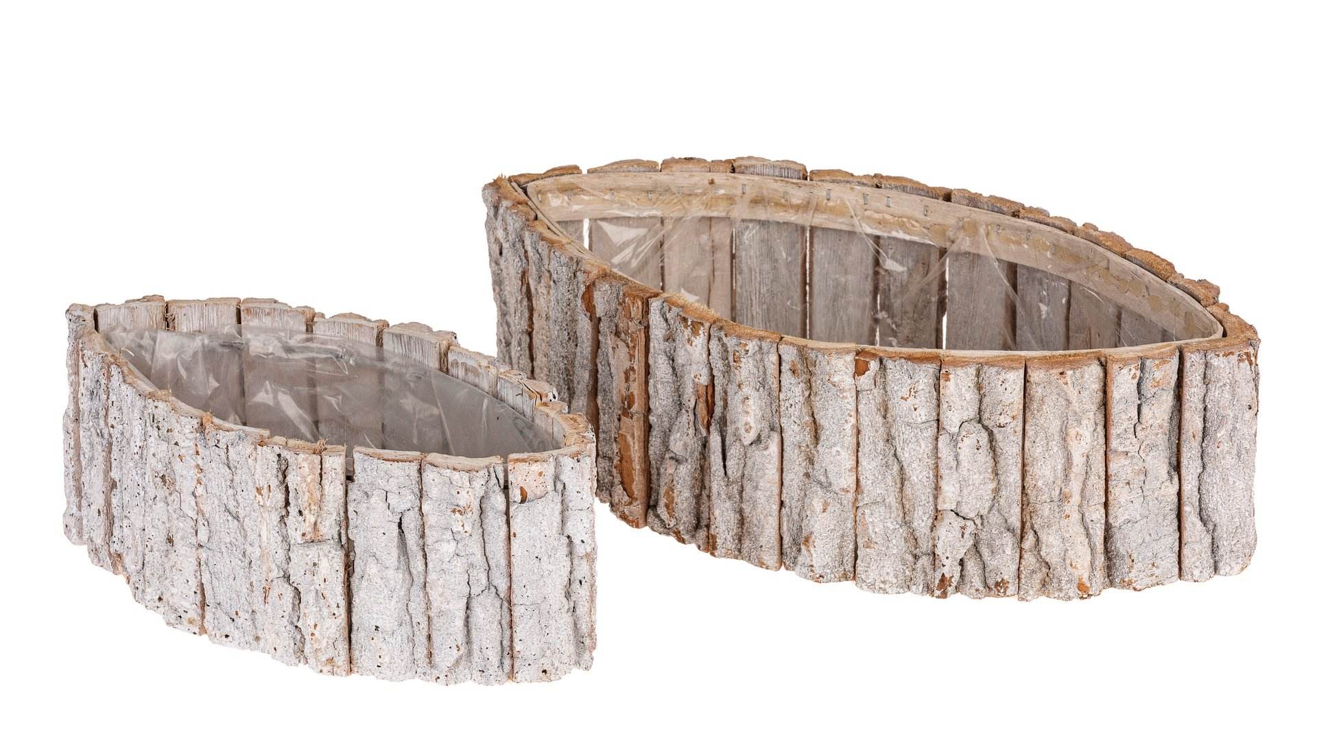 Pflanzschiffchen aus weiß gekalkter Rinde. Innen foliert. 2er Set. Größen: 25 x 12 x 9 cm, 34 x 17 x 10 cm.