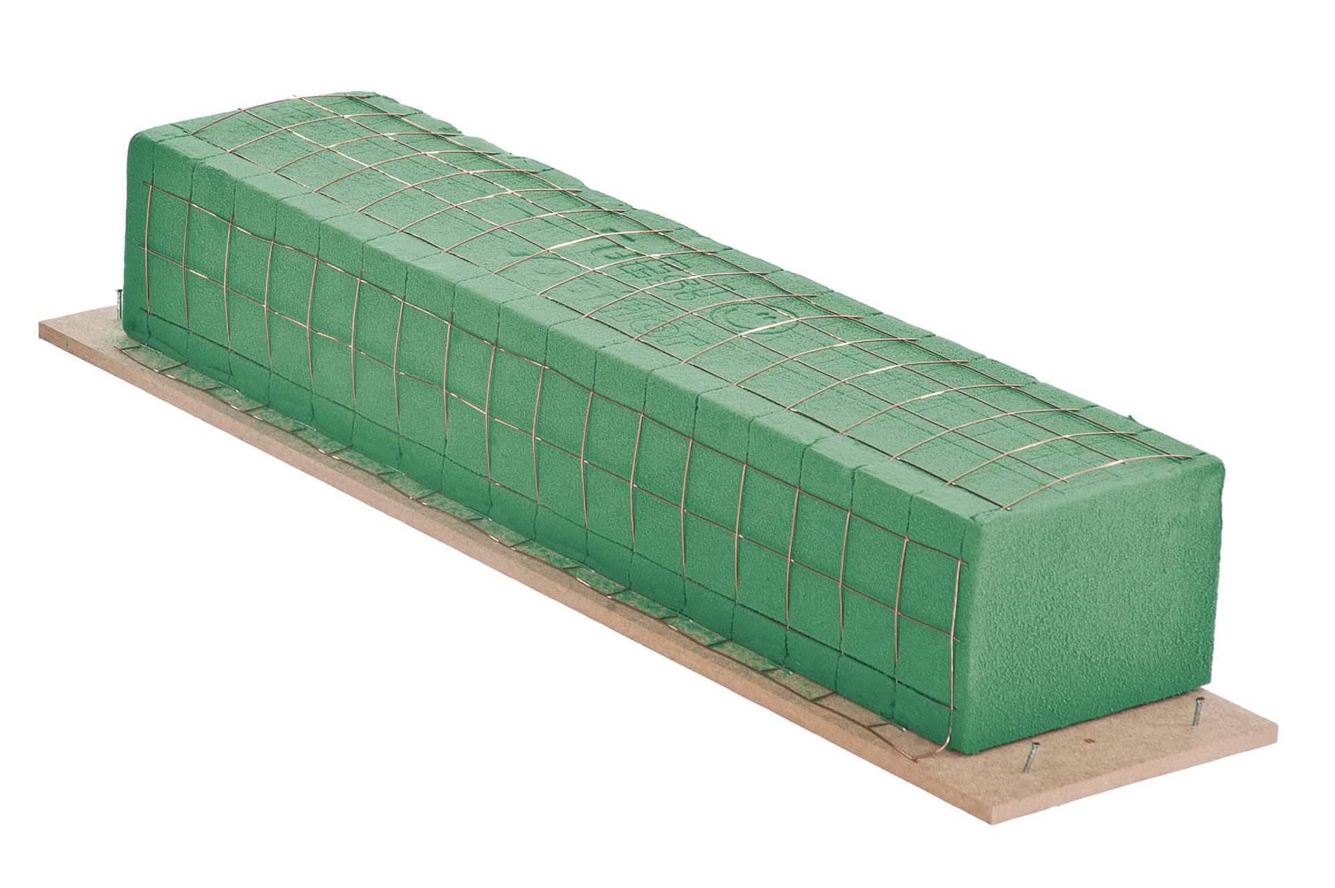 Vollholz-Sargauflage mit Steckschaum und verlängertem Holzboden für optimale Handhabung, inklusive 4 vormontierten Befestigungsstiften und 2 vorgebohrten Schraublöchern. Die Gesamtlänge der Unterlage entspricht der Steckschaumlänge (s. Tabelle) plus 6 cm.
