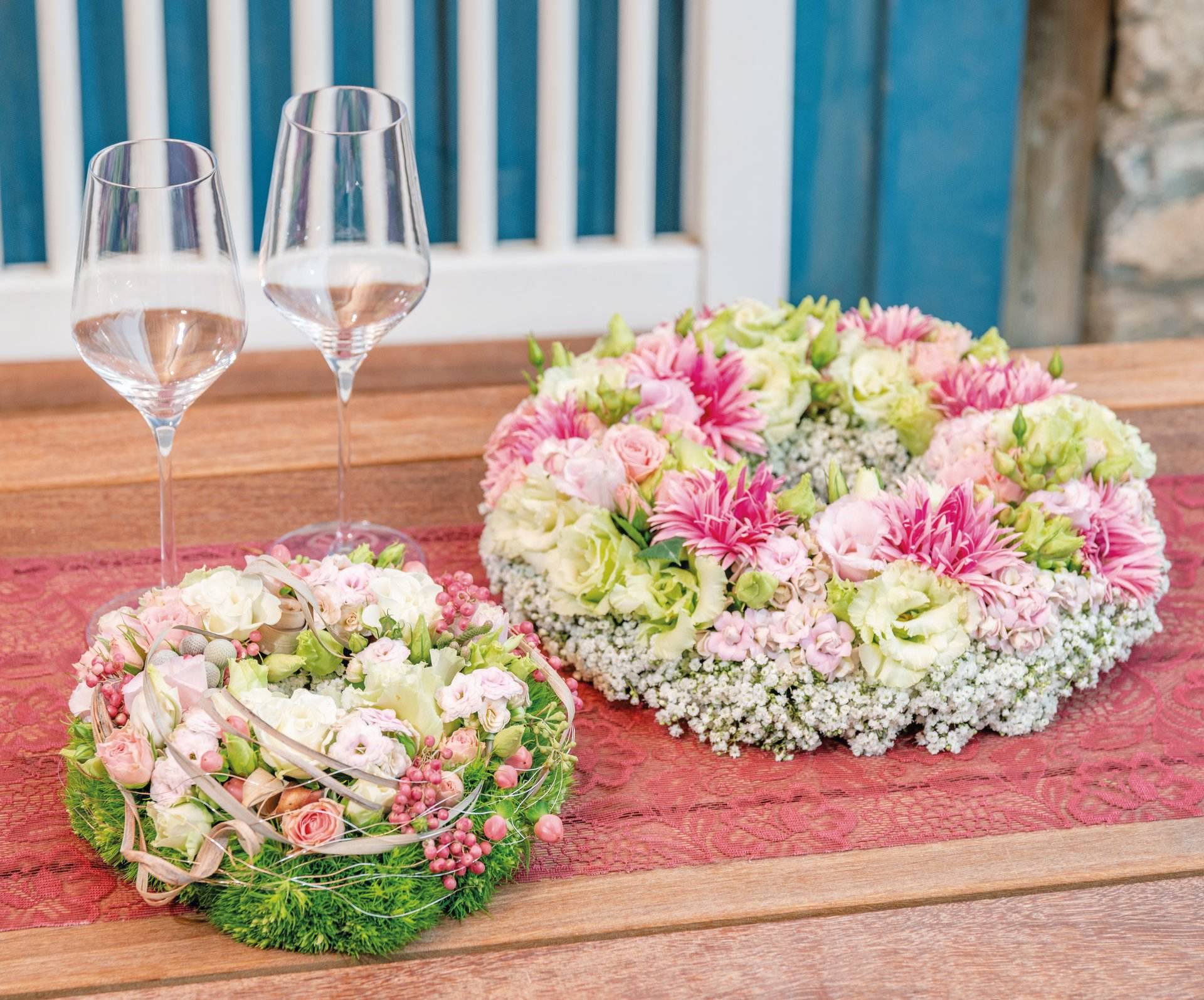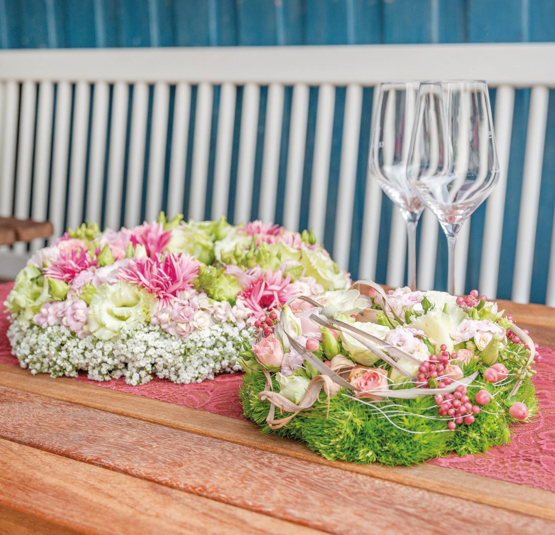 Nass-Steckschaumherz mit Drainage auf stabiler, verrottbarer Holzunterlage, zum Stellen.