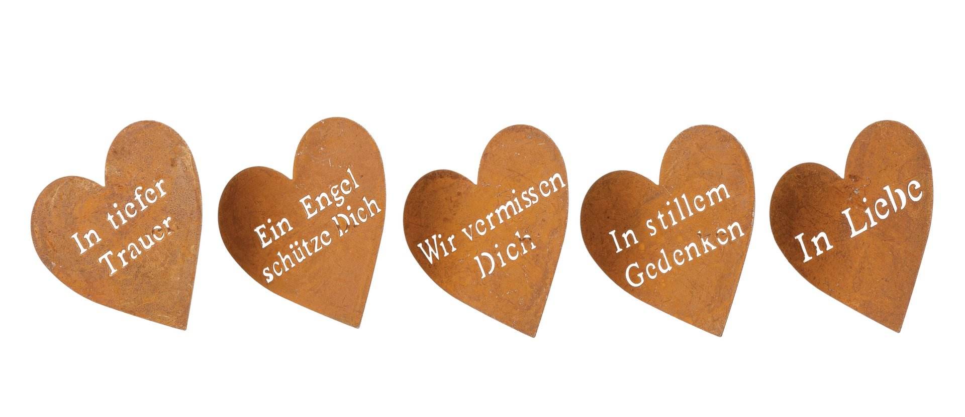 Flaches Metallherz am Pick mit ausgestanzter Schrift in Rost-Optik. 5fach sortiert.