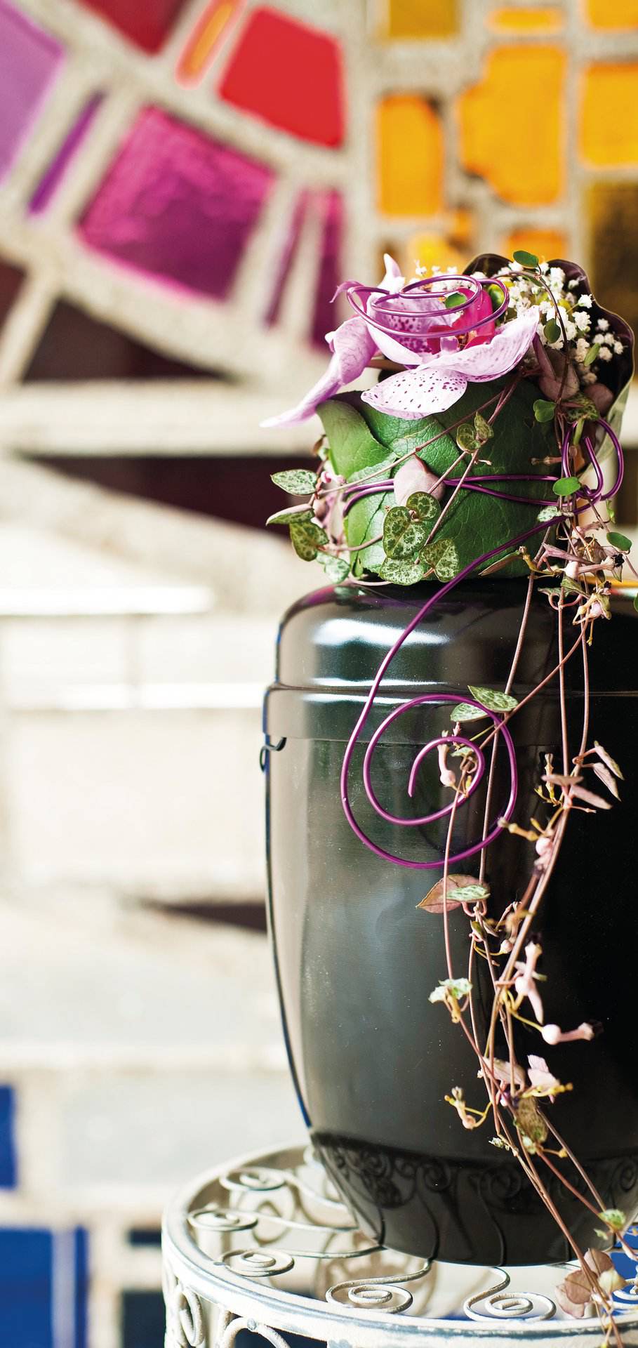 Steckschaumzylinder mit Gitterdraht und Befestigungslösung für Schmuck auf Urnen. Die Kunststoffspitzen von Urnifix® greifen tief in den Steckschaum, die starken Klebepunkte auf der Unterseite ermöglichen eine einfache und sichere Verbindung mit der Urne. Passend für jede Urnengröße.