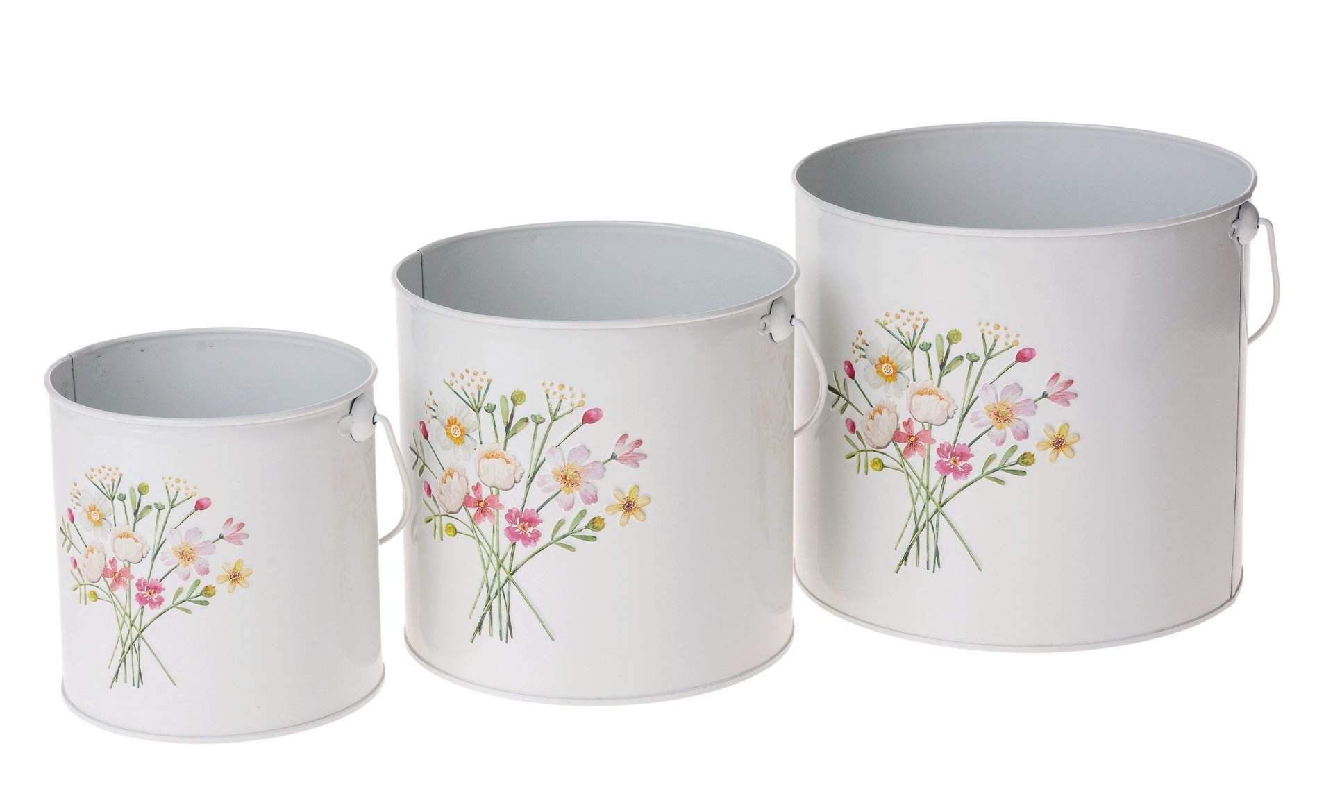 Topf aus Metall mit Henkel und floralem Motiv auf der Vorderseite. 3er Set. Größen: Ø 12 x 12 cm, Ø 15 x 14,5 cm und Ø 18,5 x 16,5 cm.