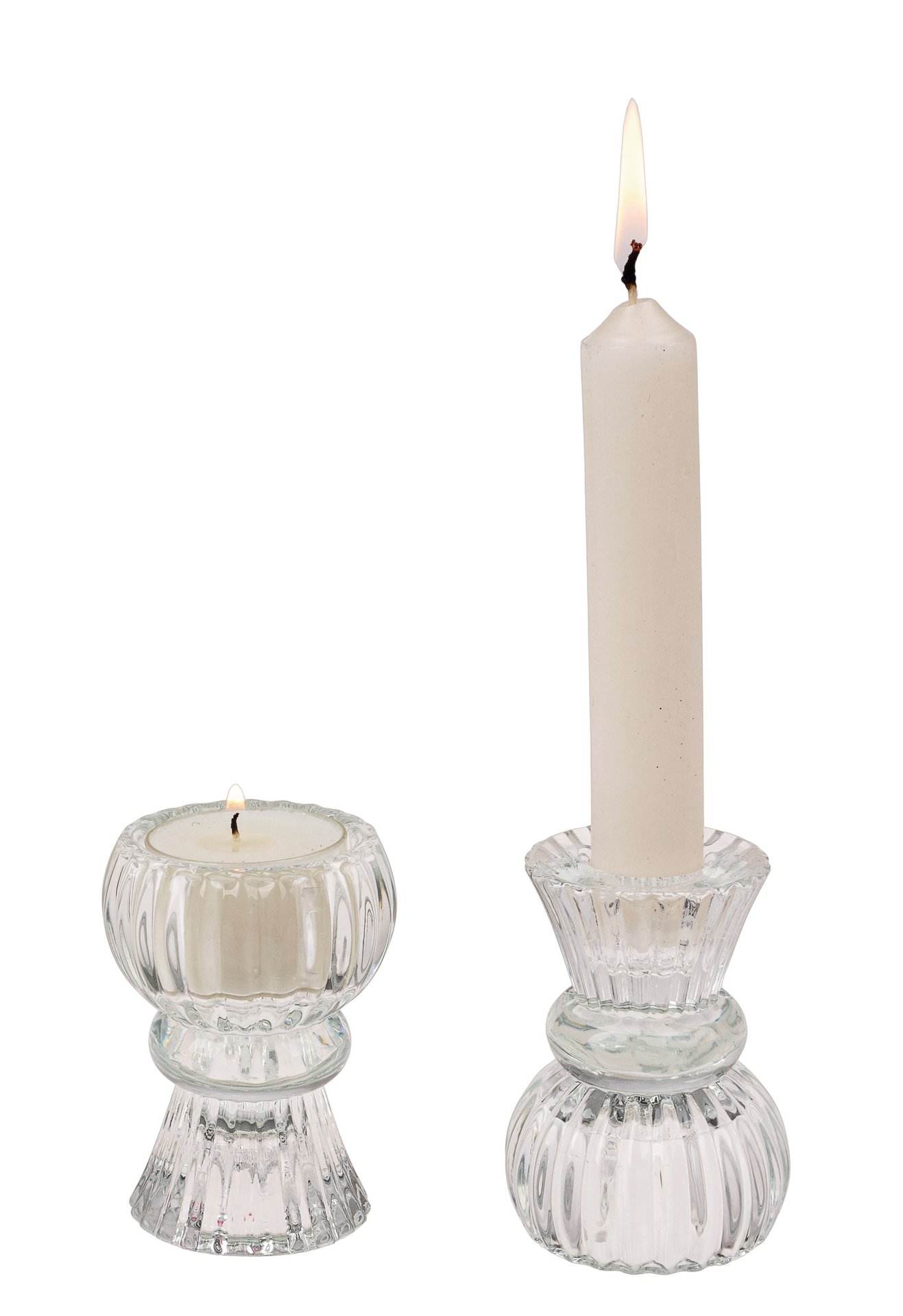 Bauchiger Kerzenhalter aus Glas. Kann beidseitig verwendet werden.Für Stabkerzen und Teelichter mit einem Durchmesser von 2,2 cm oder 3,5 cm.