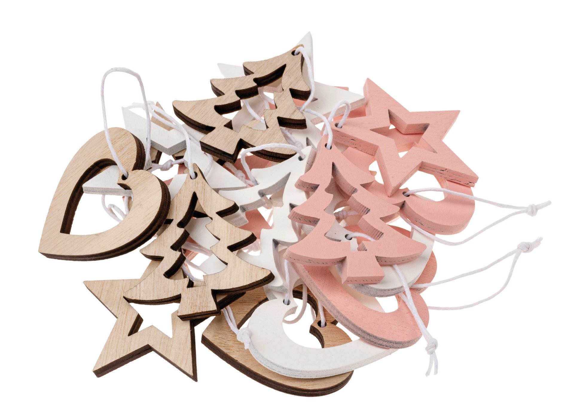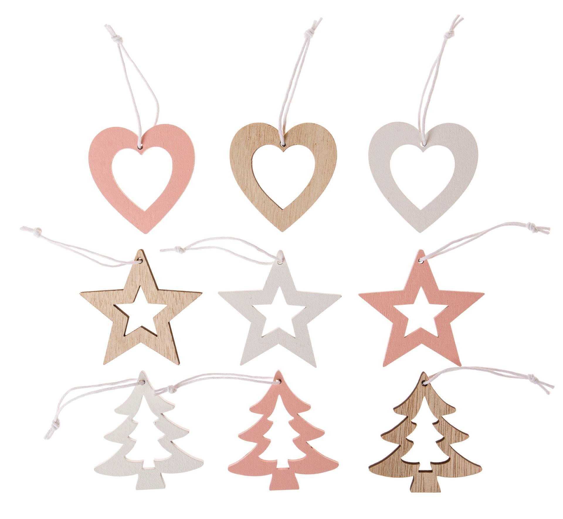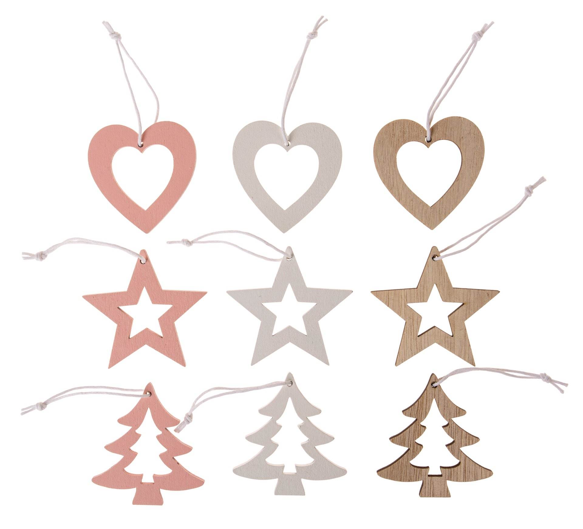Anhänger aus Holz zum Dekorieren. 3-fach sortiert: Herz, Stern und Baum in je drei Farben. 9 Stück pro Box.