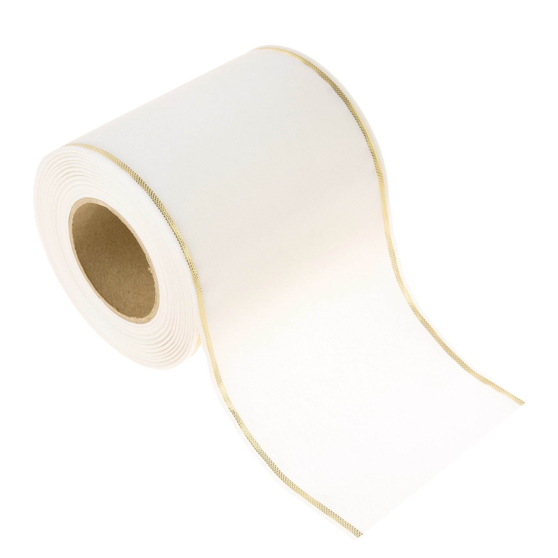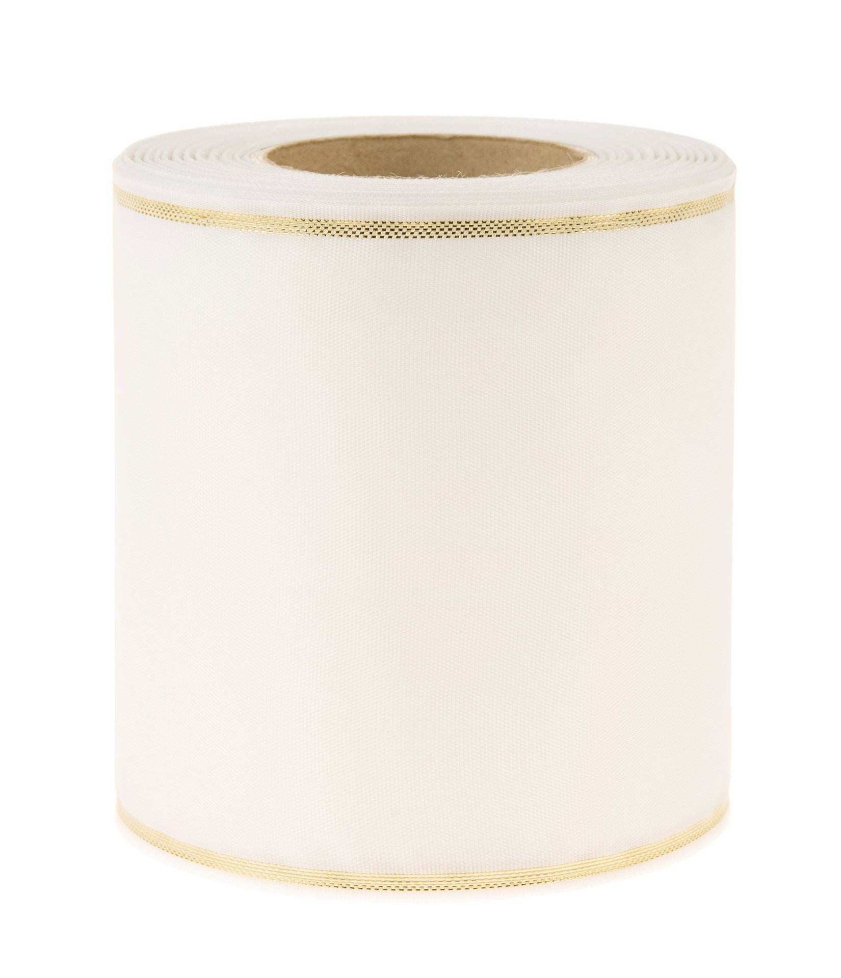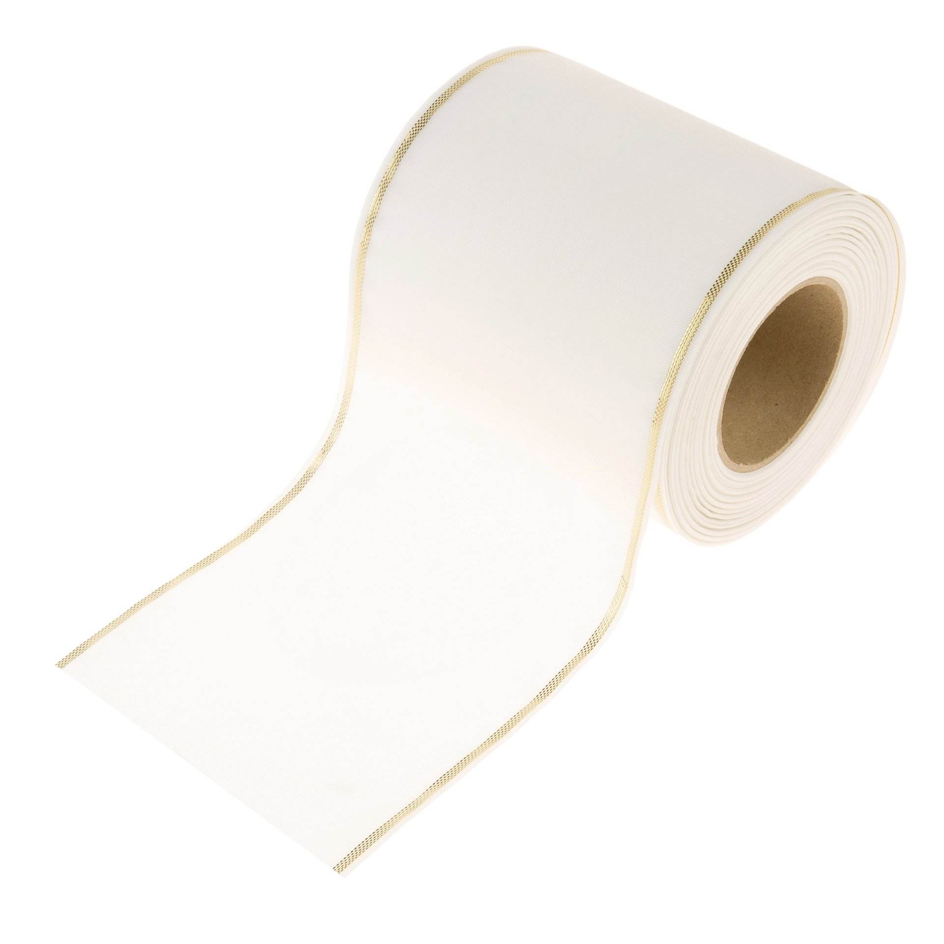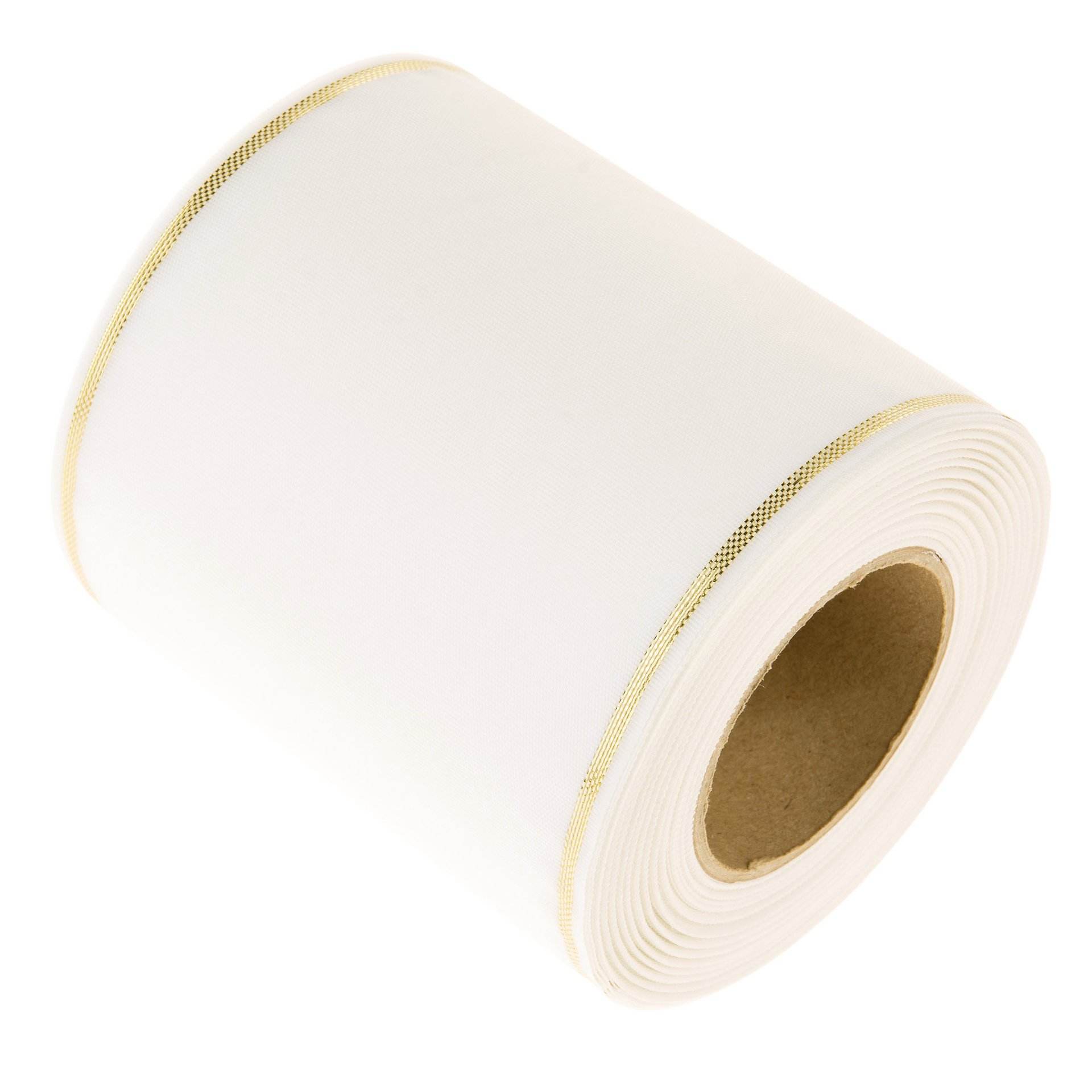 Edles Moiré-Kranzband mit eingewebtem Goldrand in verschiedenen Breiten. Länge: 25 m.