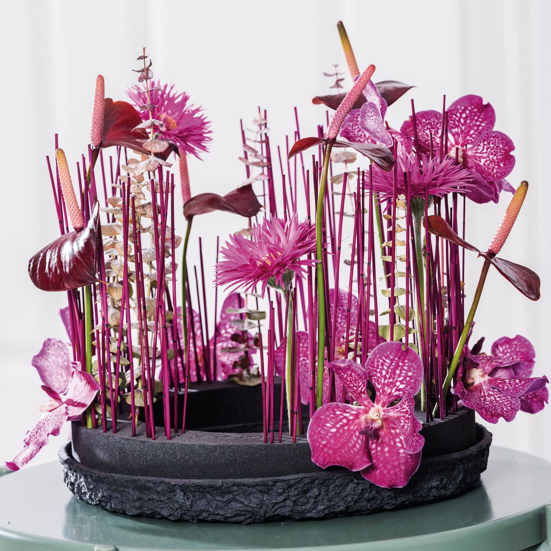 Der Steckschaumring eignet sich nicht nur für die Trauerfloristik. Es ergeben sich neue Gestaltungsgrundsätze: Der Schaum muss nicht komplett bedeckt werden, die durchscheinende schwarze Basis verleiht Tiefe und wird zum Gestaltungselement. Farbe: schwarz.