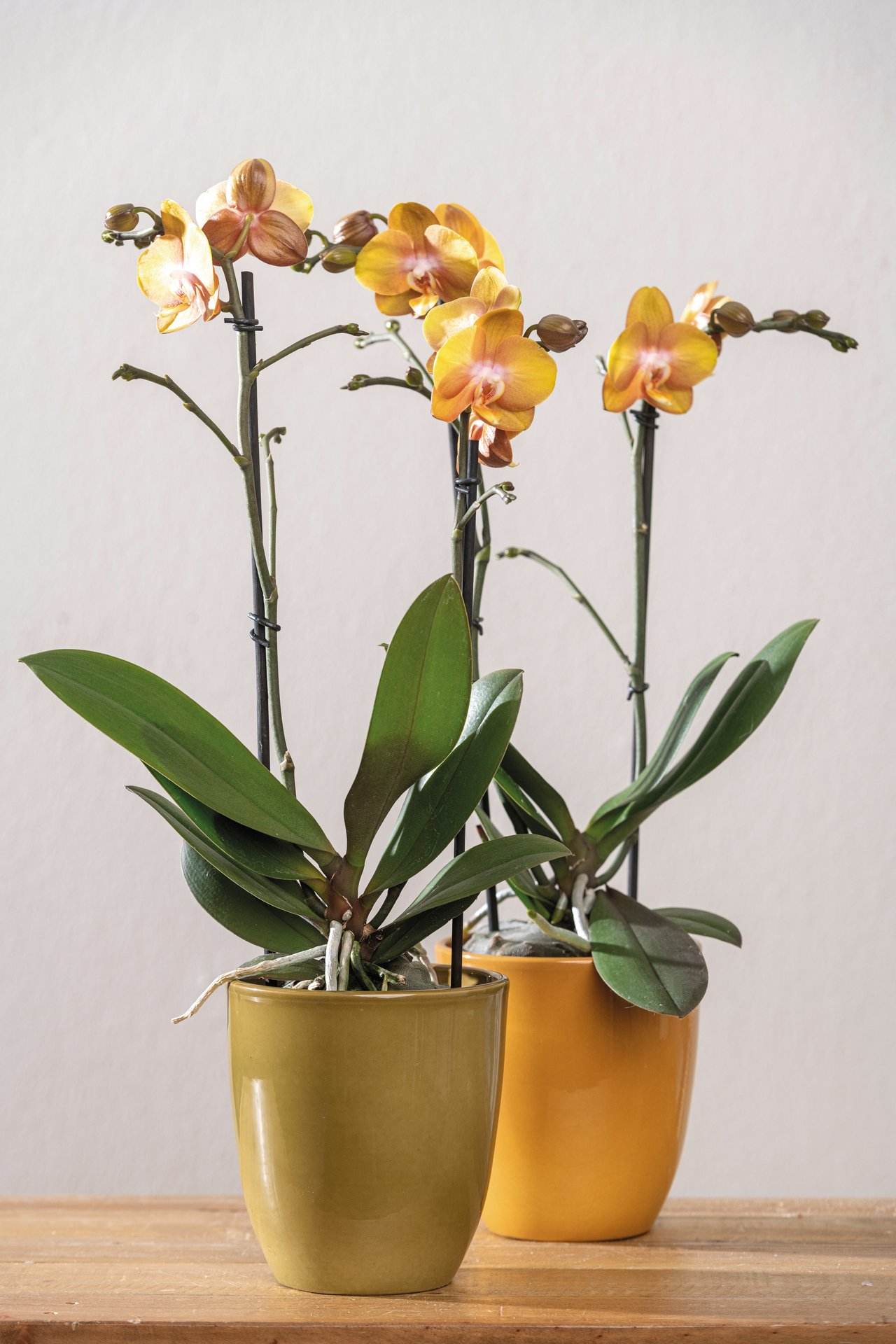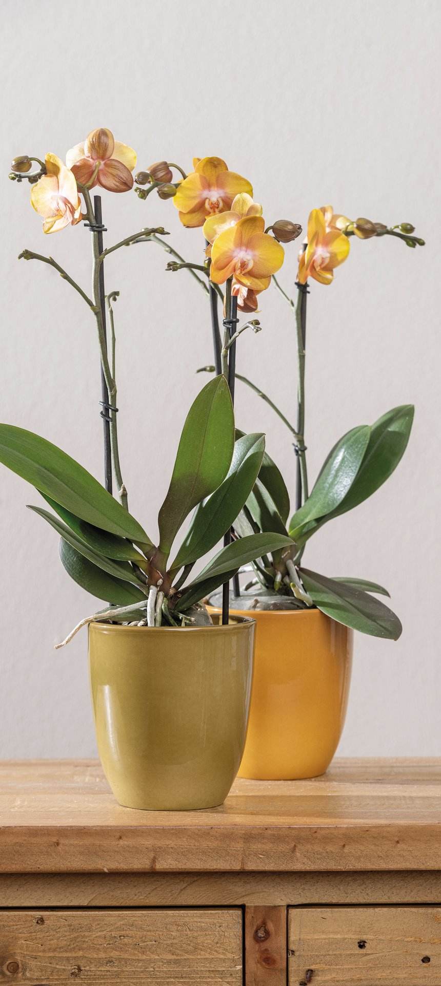 Konischer Orchideentopf mit integriertem Keramiksteg gegen Staunässe. 3-fach sortiert: Braun-Beige, Curry, Pistazie.