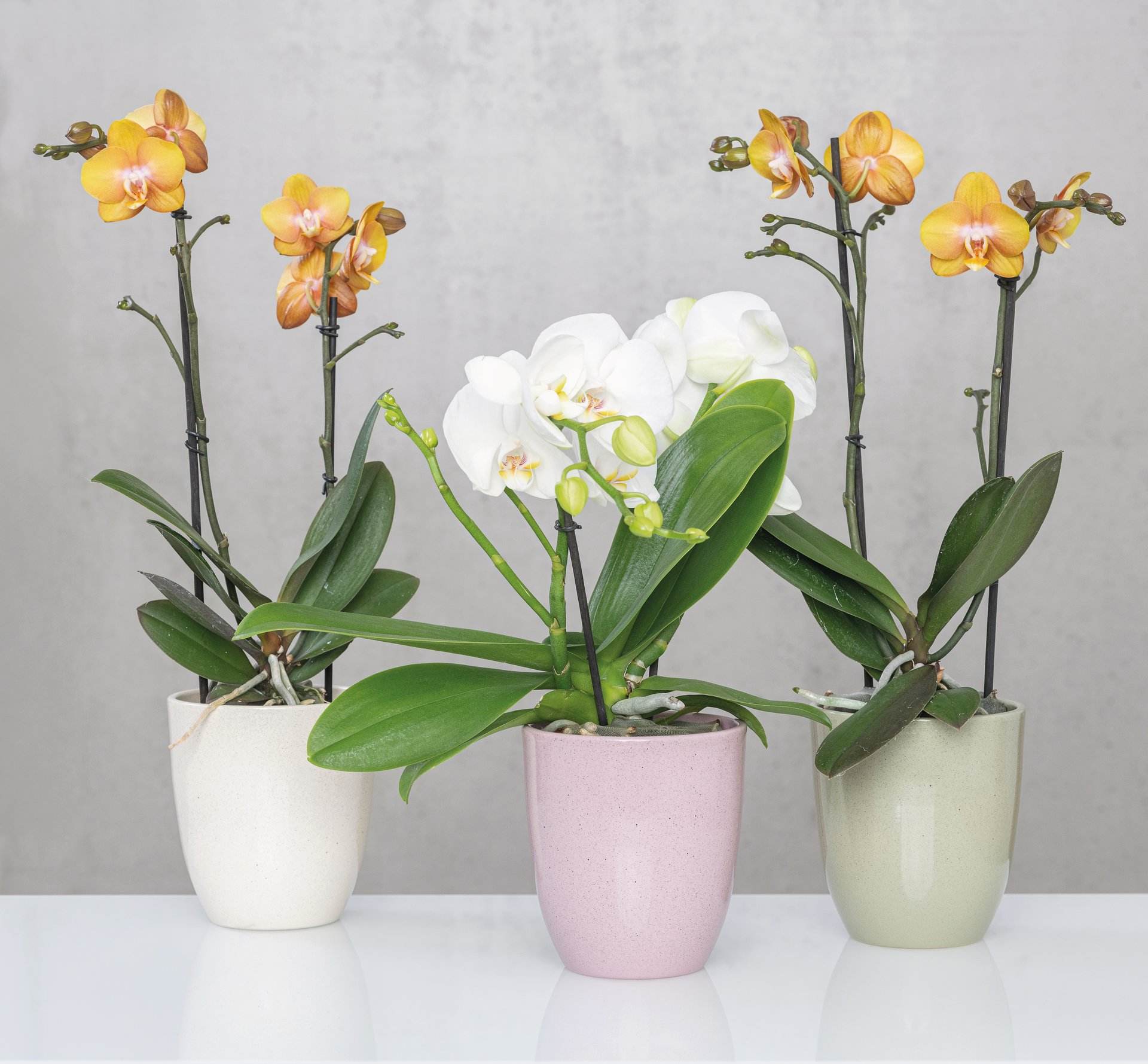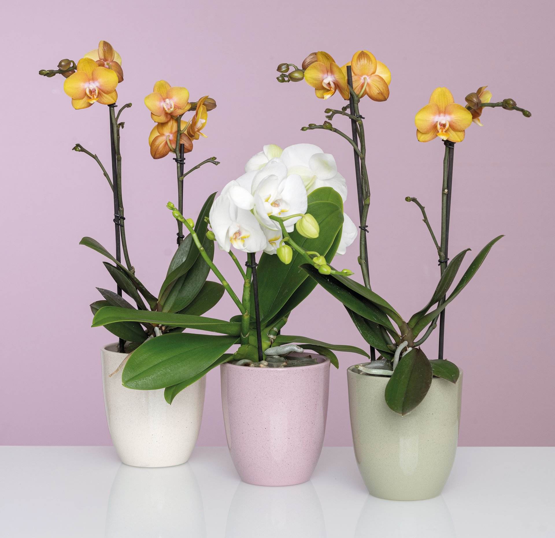 Konischer Orchideentopf mit integriertem Keramiksteg gegen Staunässe in gesprenkelter Steinoptik-Glasur. 3-fach sortiert: Beige, Rosa, Kiwi.