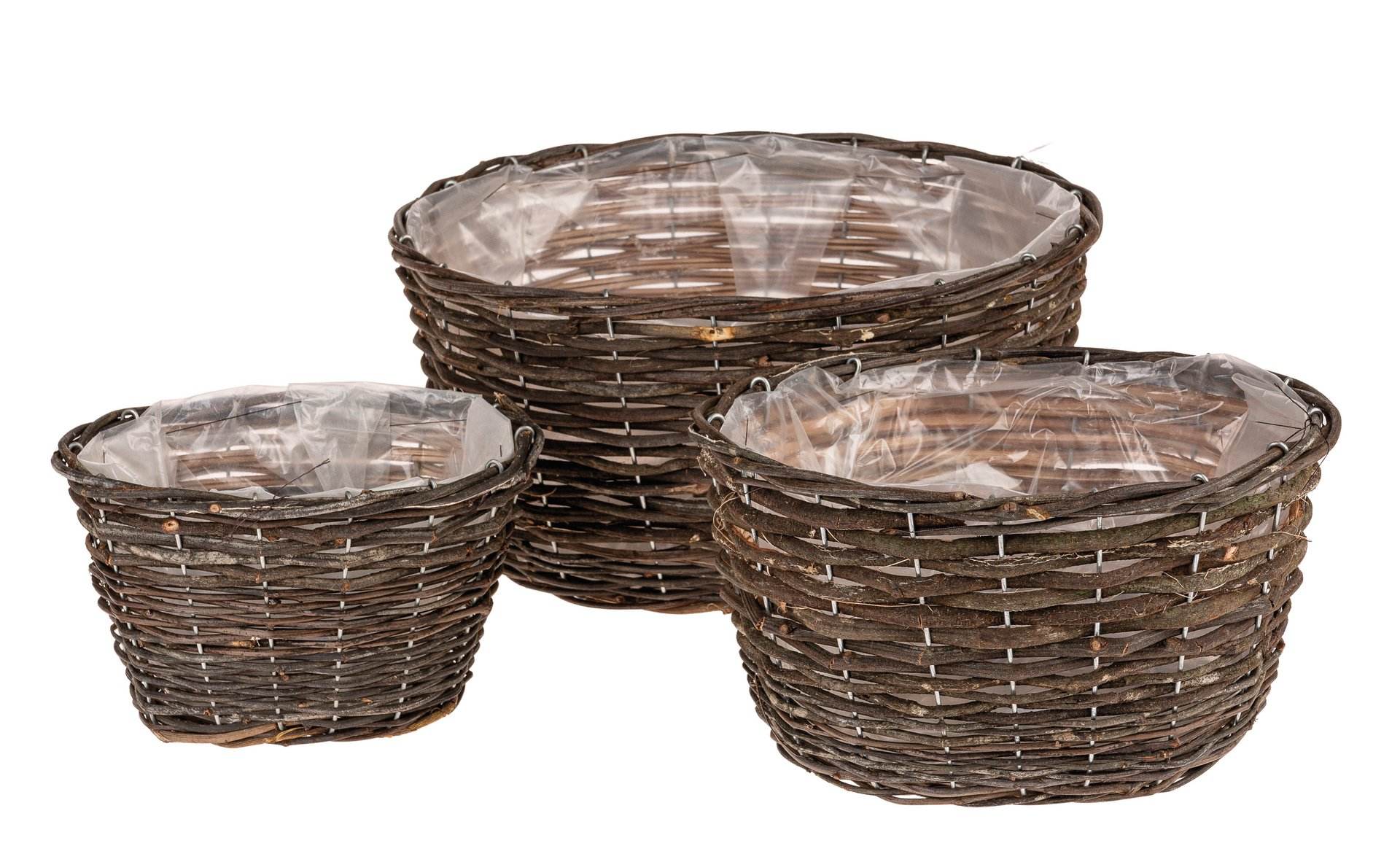 Ovaler Pflanzkorb aus Rattan. Innen foliert. 3er Set.Größen: 19 x 14 x 12 cm, 27 x 20 x 14 cm, 31 x 25 x 16 cm.