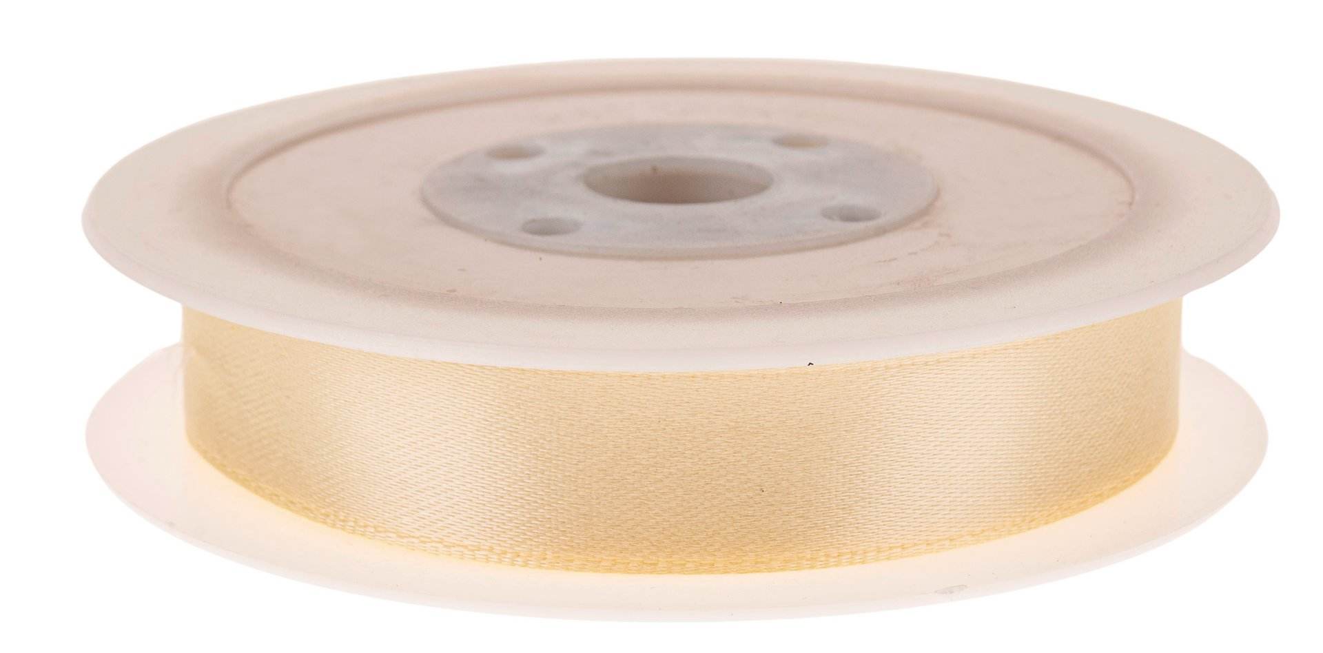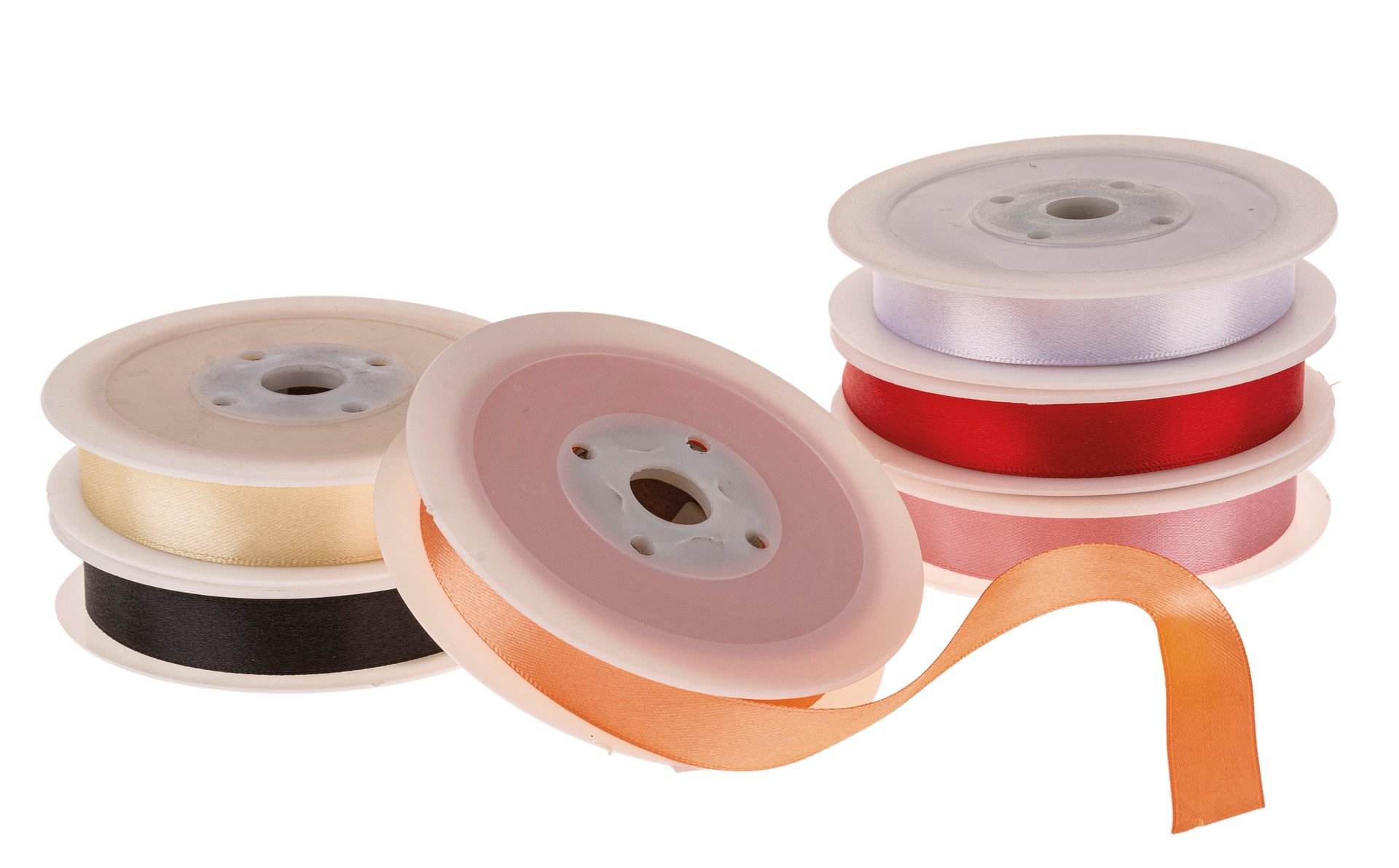 Zartes Organzaband mit gewebter Kante. Größen: 6 mm x 50 m, 15 mm x 50 m und 25 mm x 50 m.