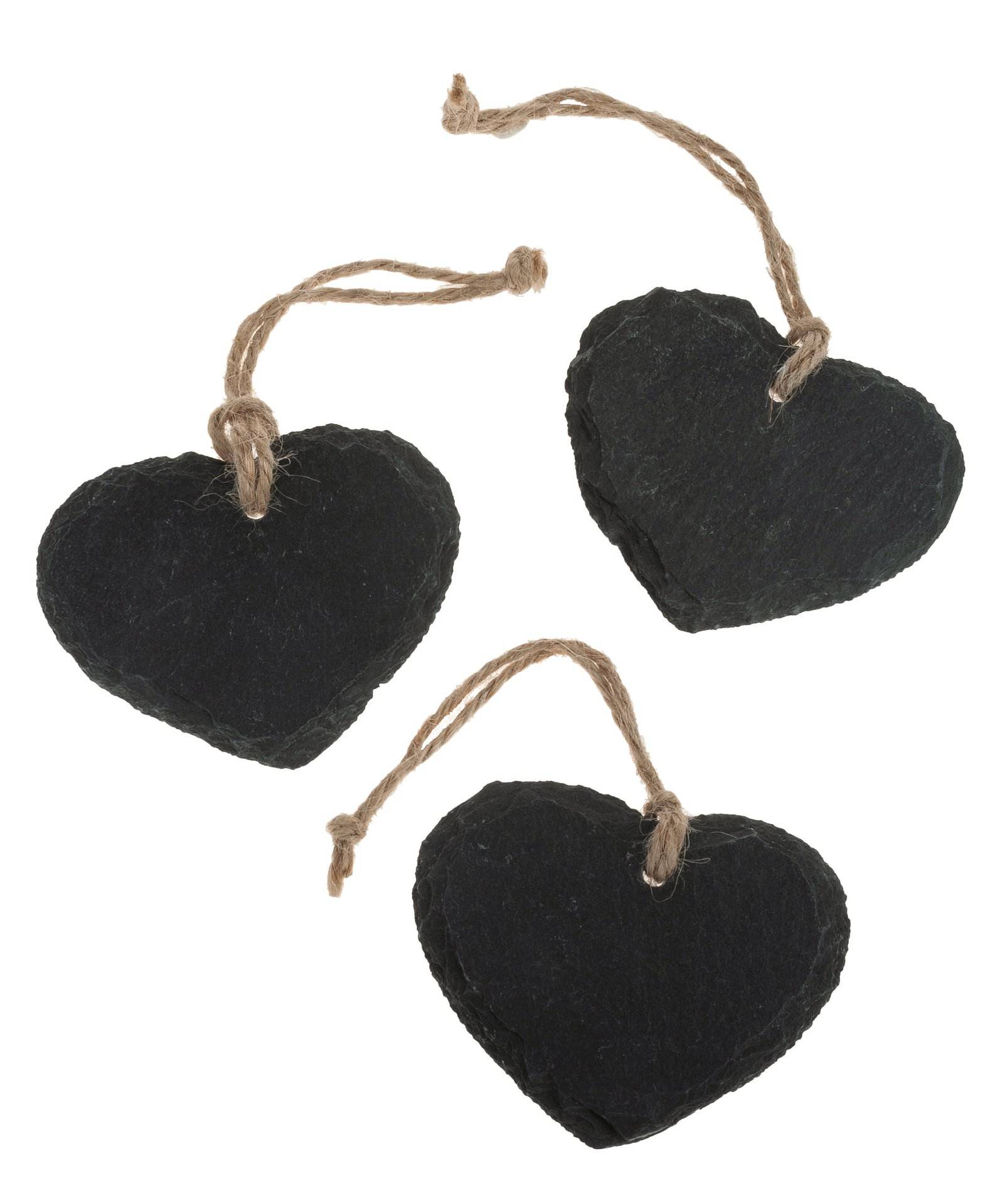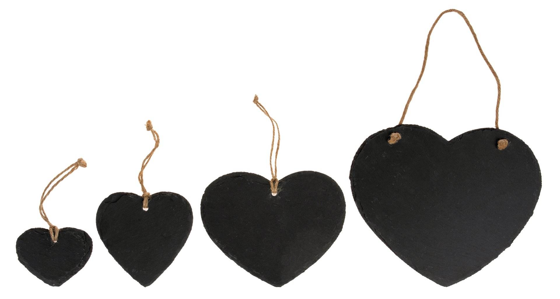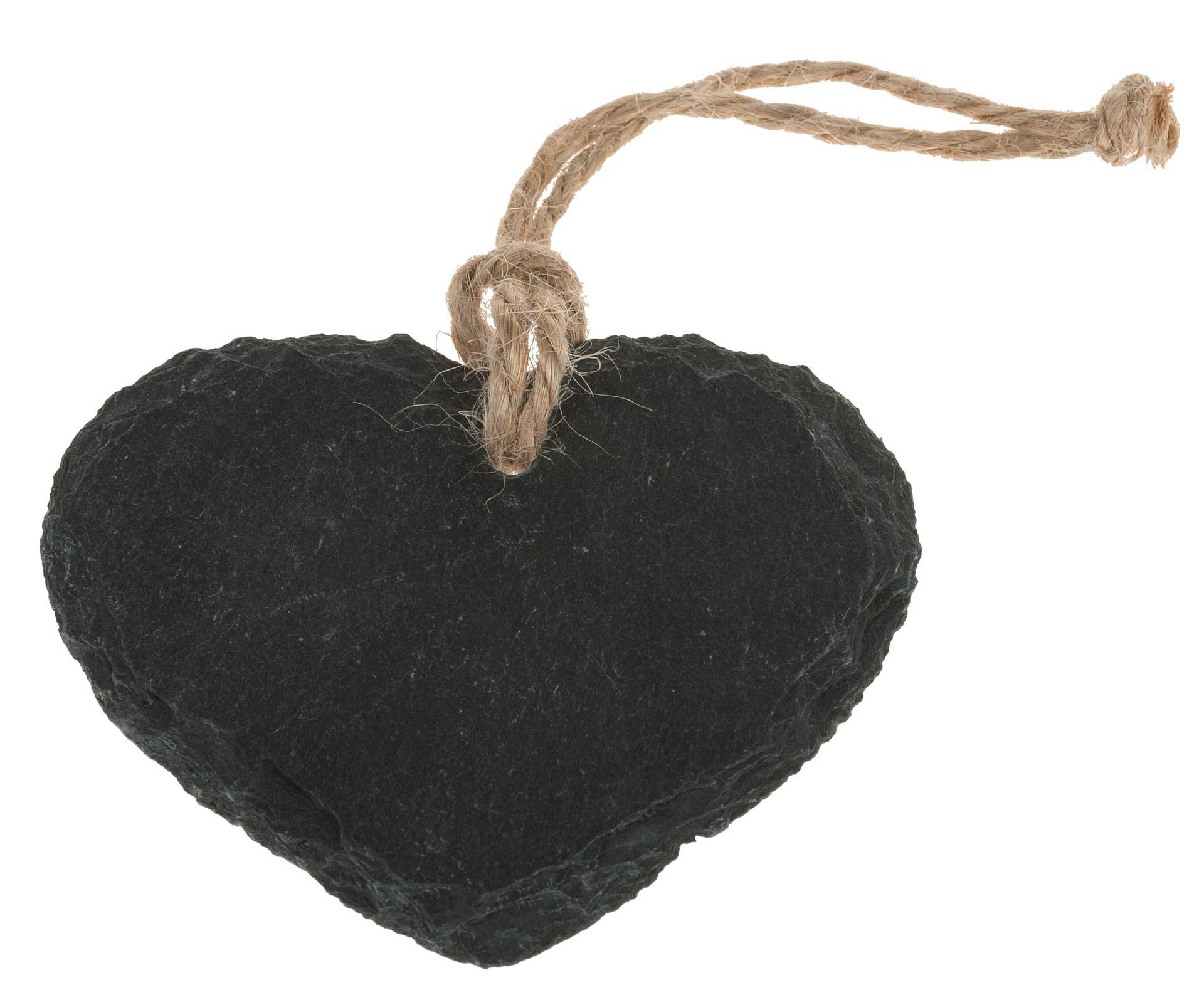 Naturschieferplatte in Herzform zum Hängen mit Jutekordel. Die Herzen können mit Tafelkreide oder Kreidestiften beschriftet werden.