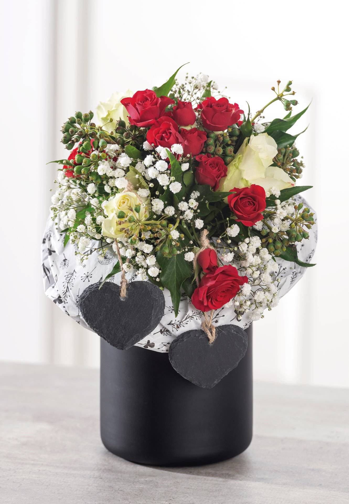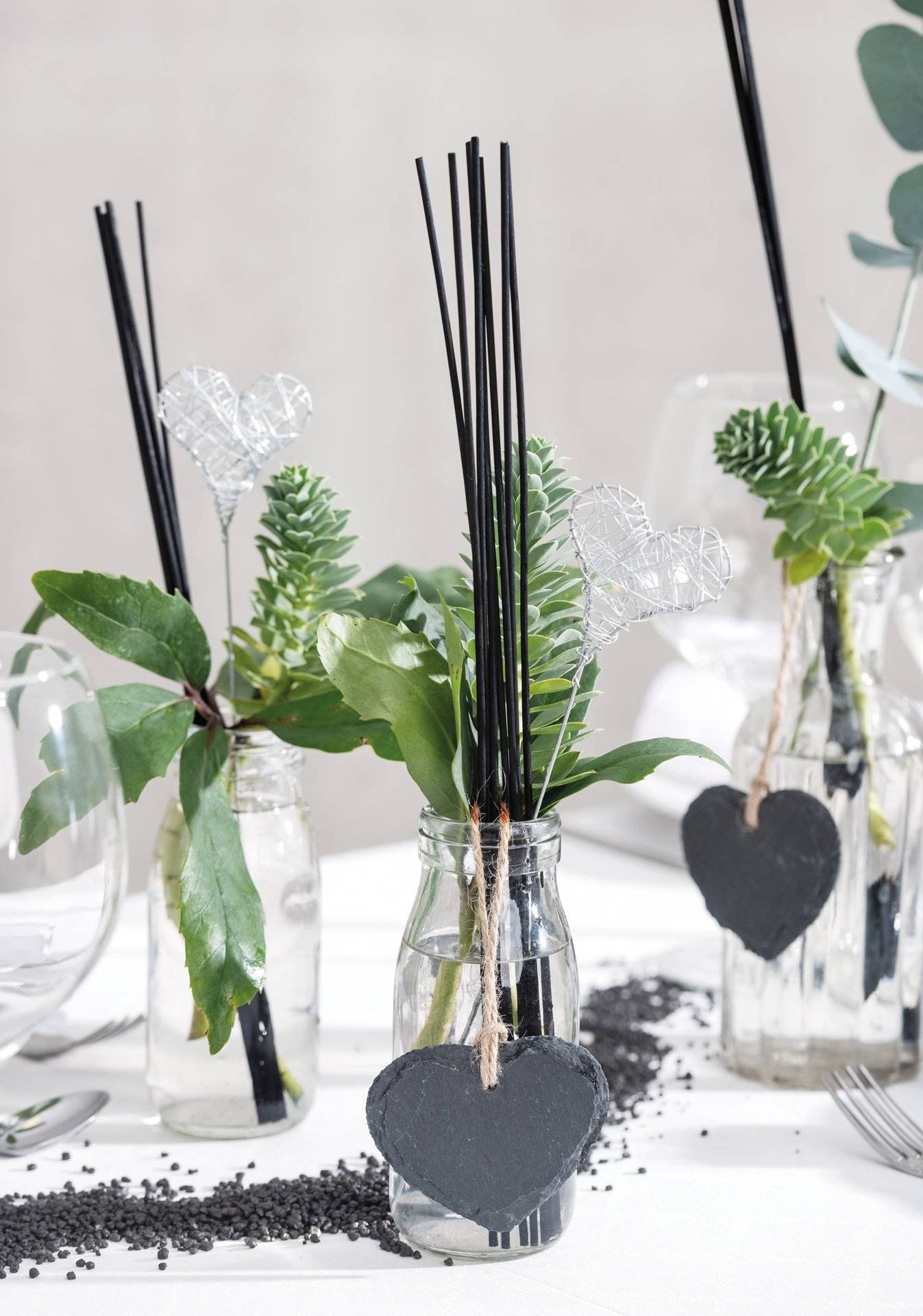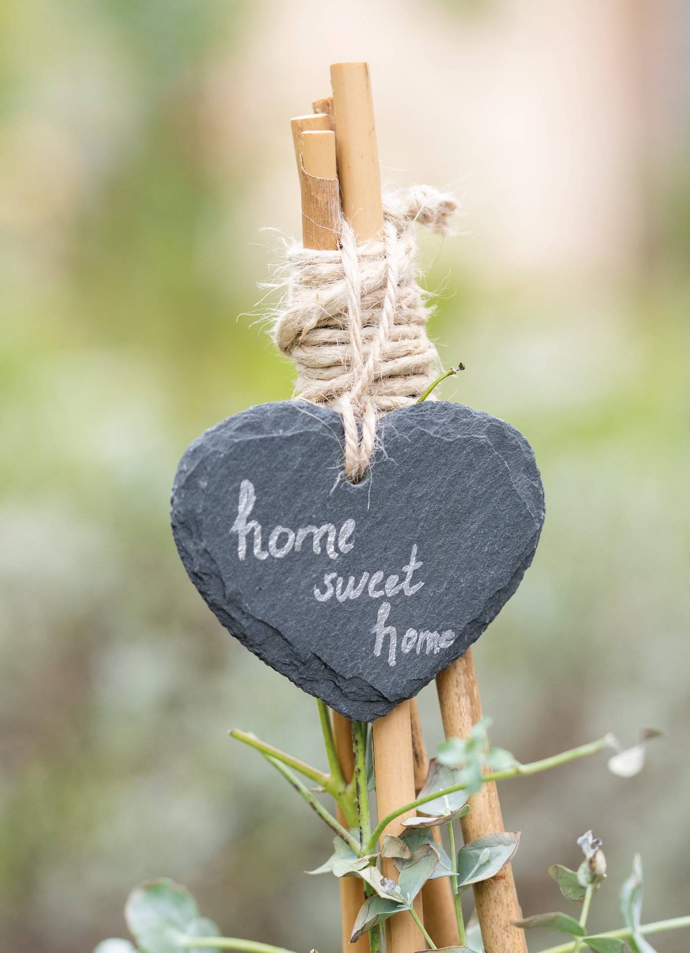 Naturschieferplatte in Herzform zum Hängen mit Jutekordel. Die Herzen können mit Tafelkreide oder Kreidestiften beschriftet werden.
