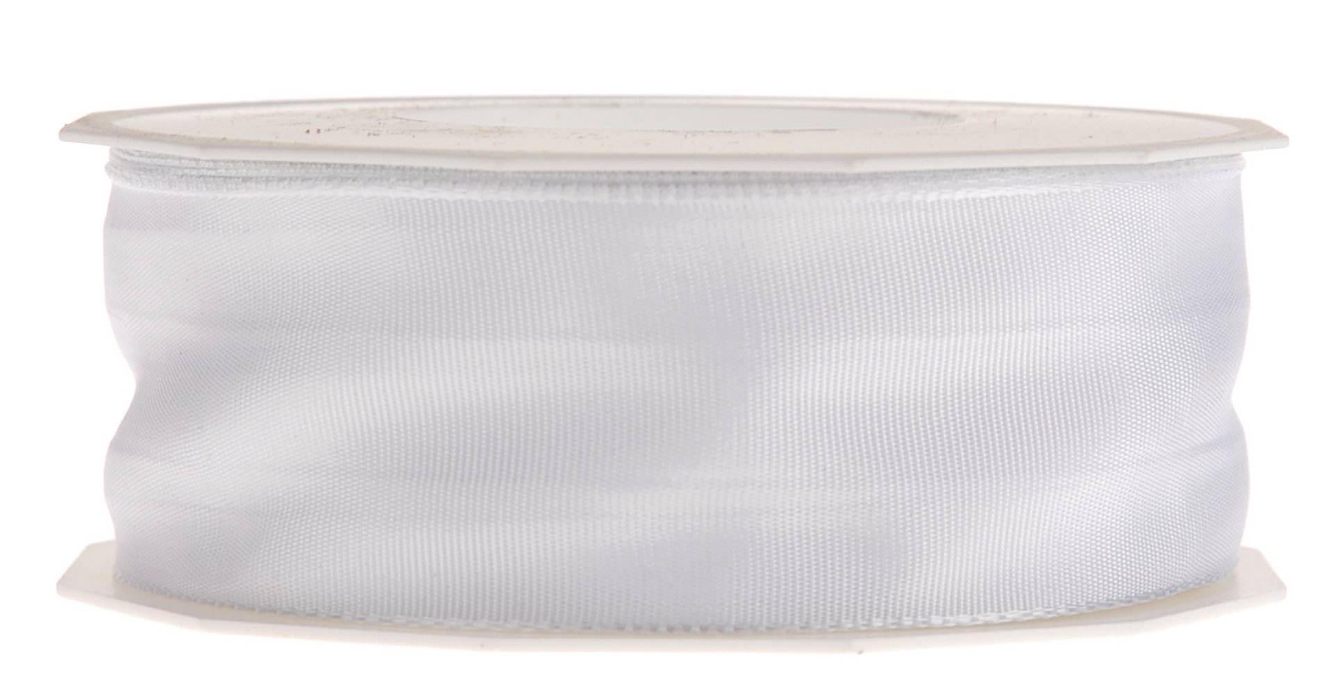 Zartes Organzaband mit gewebter Kante. Größen: 6 mm x 50 m, 15 mm x 50 m und 25 mm x 50 m.