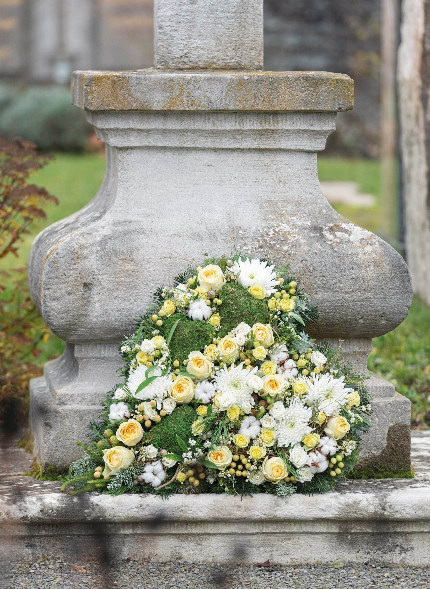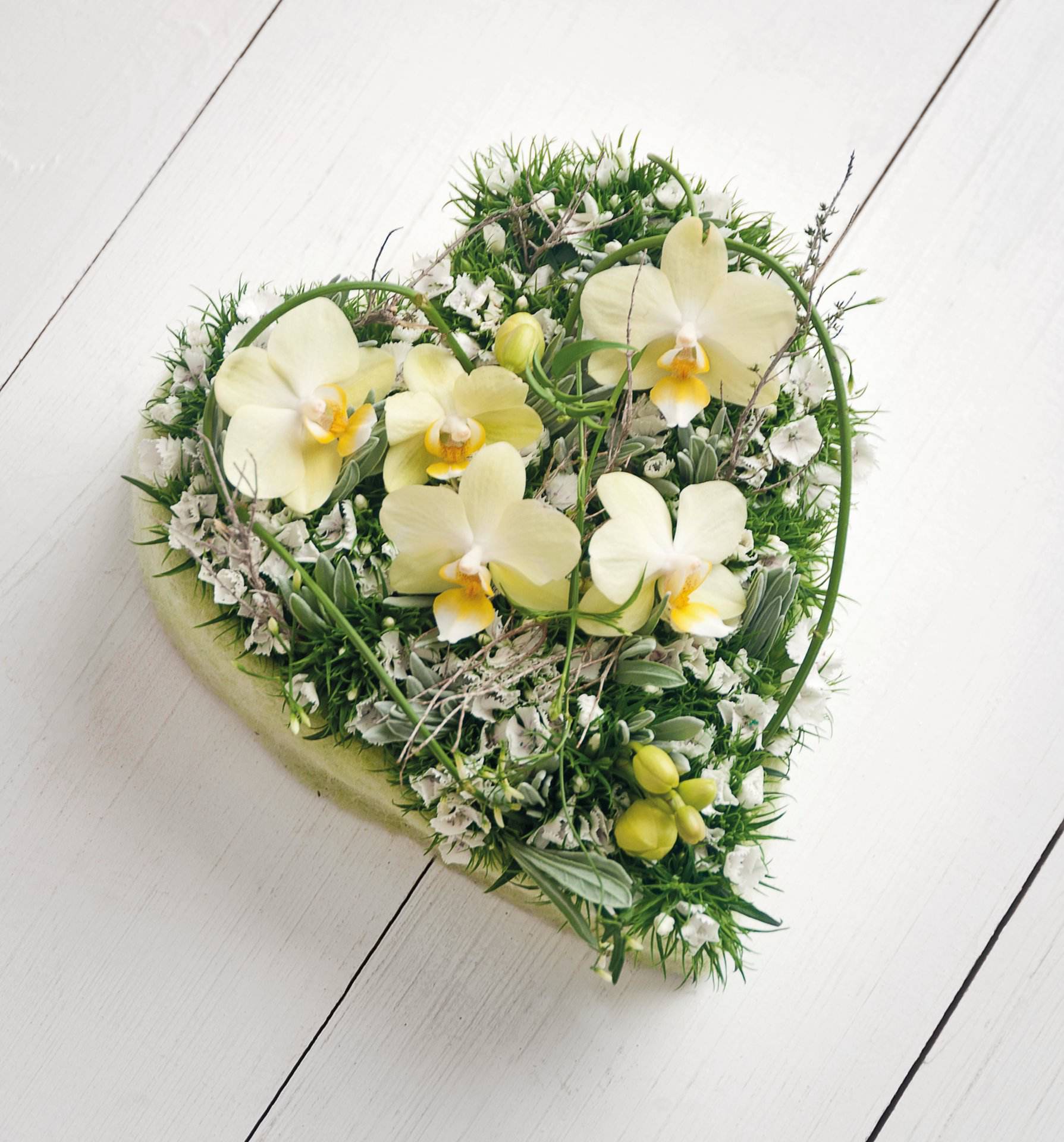 Nass-Steckschaumherz auf stabiler, verrottbarer Holzunterlage.
