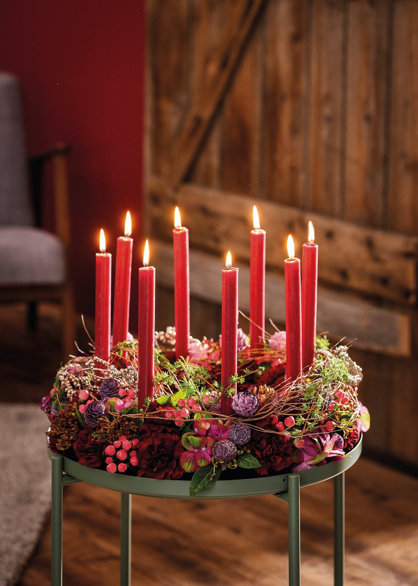 Nass-Steckschaumring auf Kunststoffunterlage mit Kunststoffgitter inkl. Aussparungen für Stabkerzen: N° 200817: für 4 Kerzen, N° 200818 und N° 200819: für je 8 Kerzen.