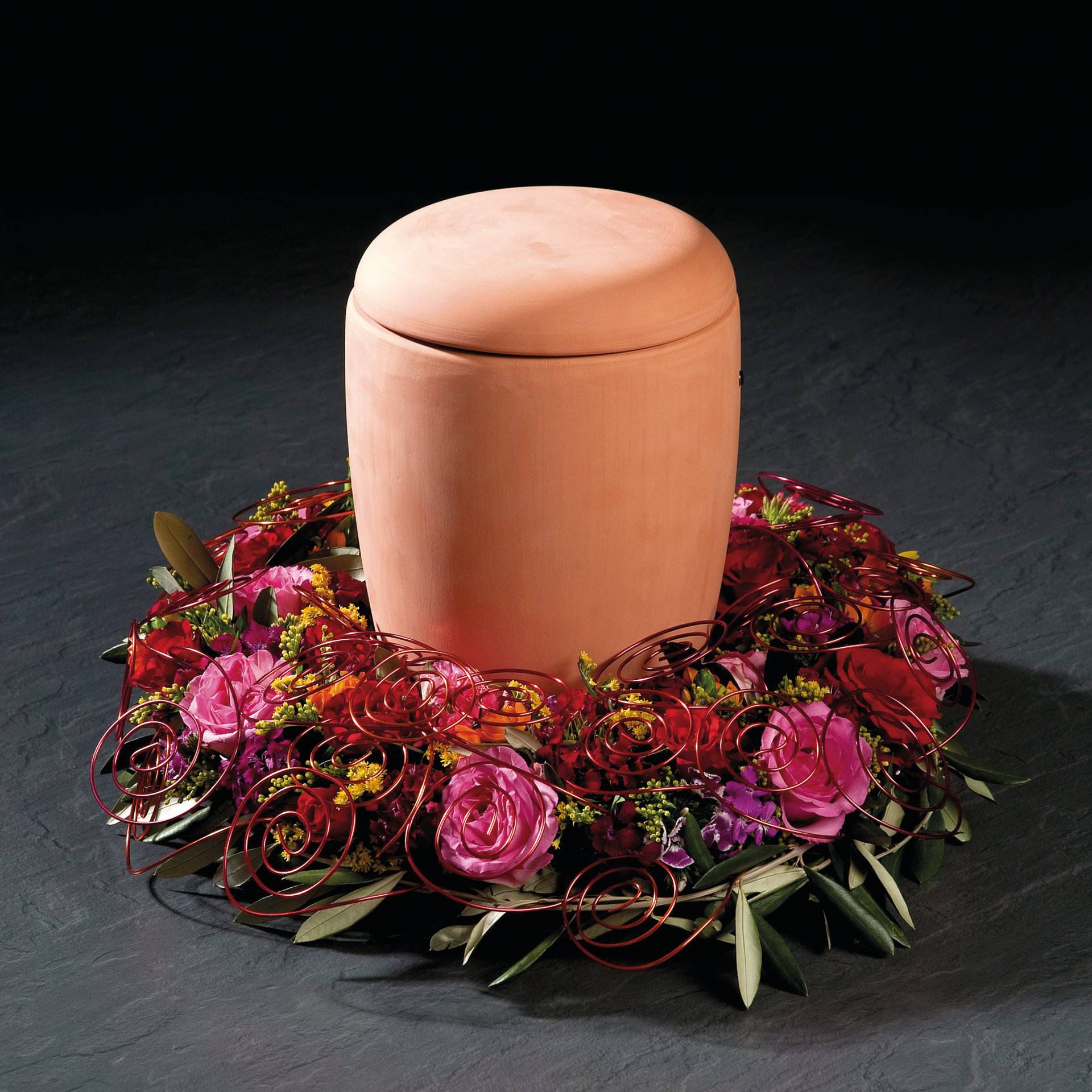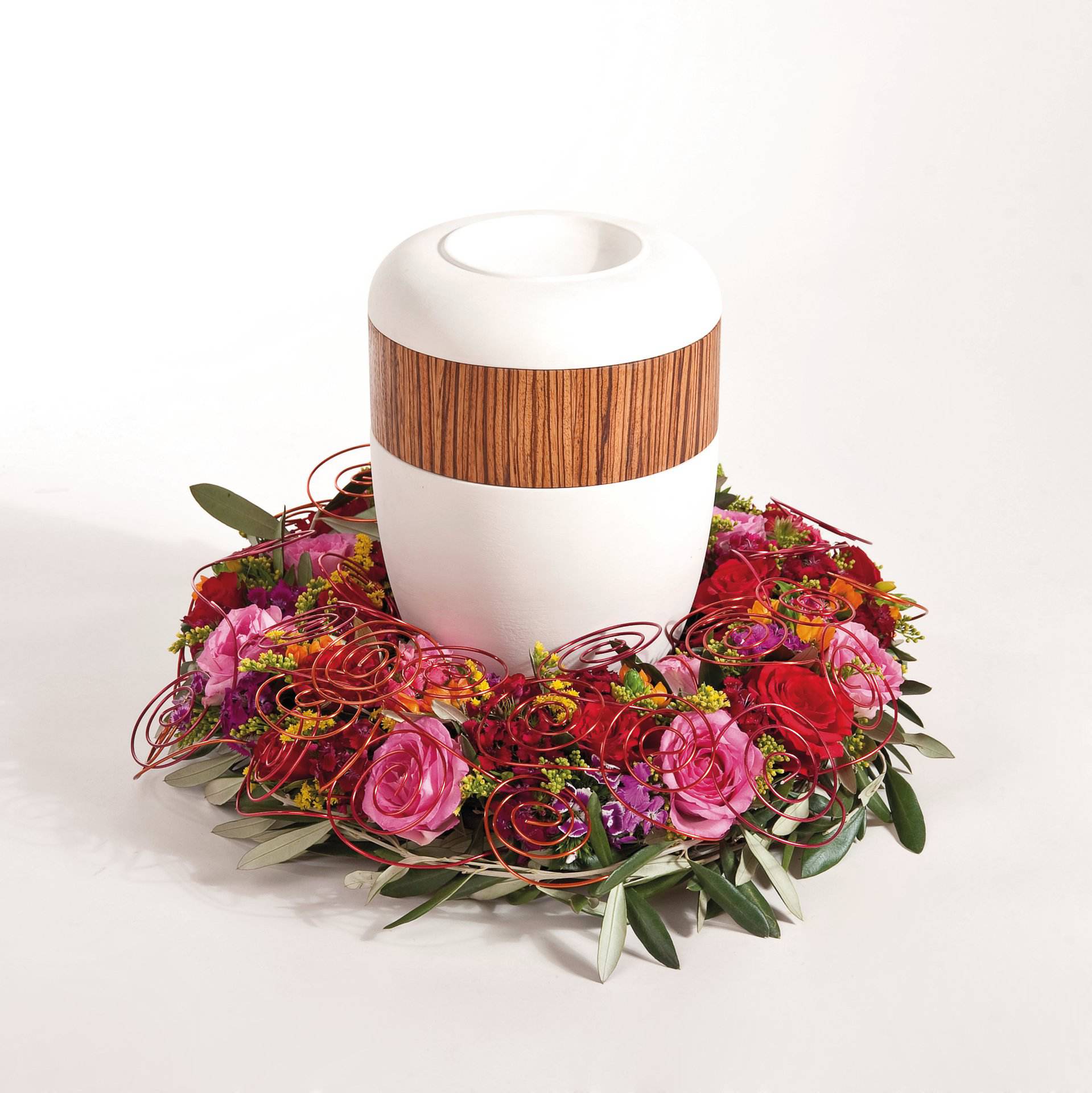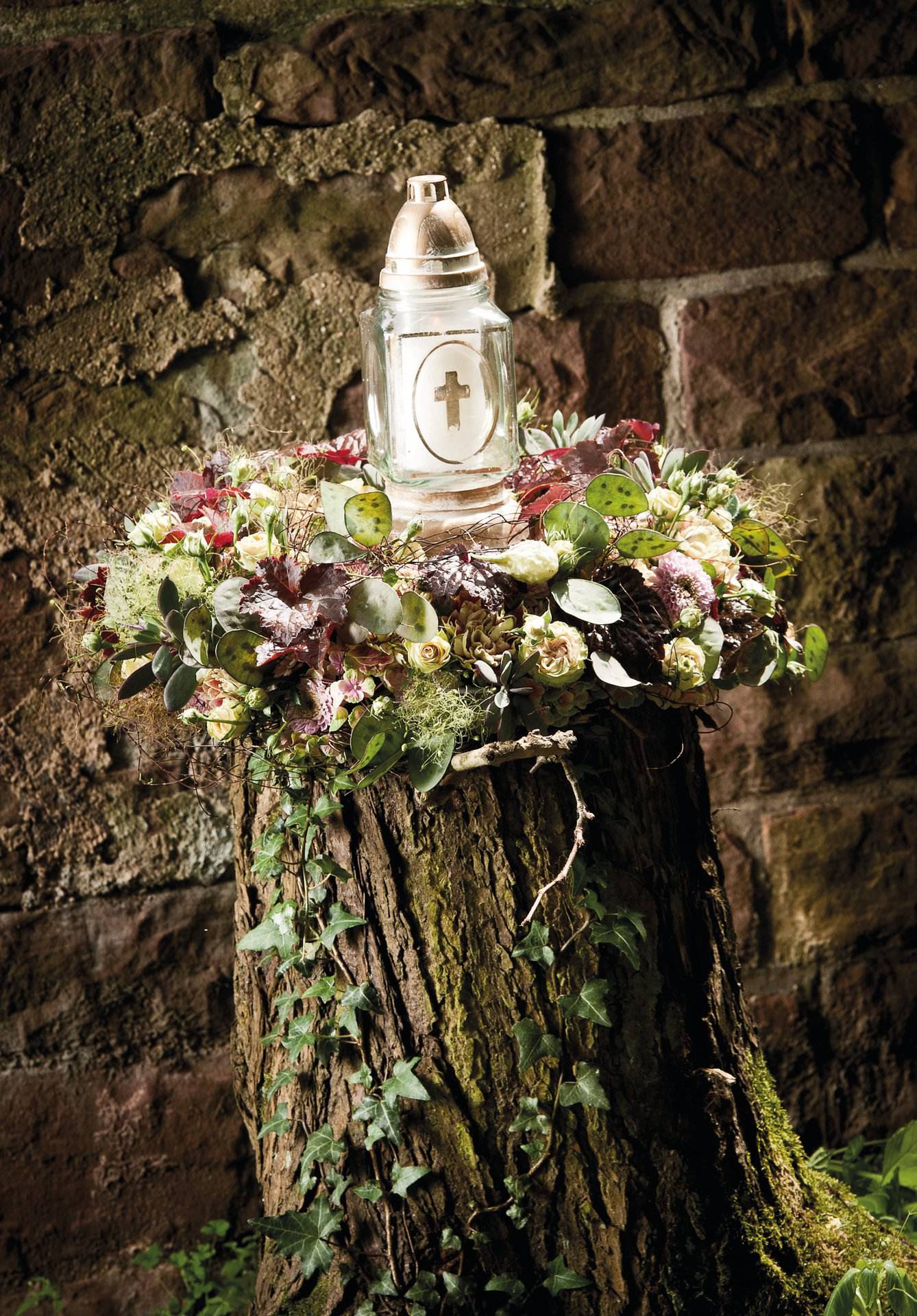 Nass-Steckschaumherz auf stabiler, verrottbarer Holzunterlage.