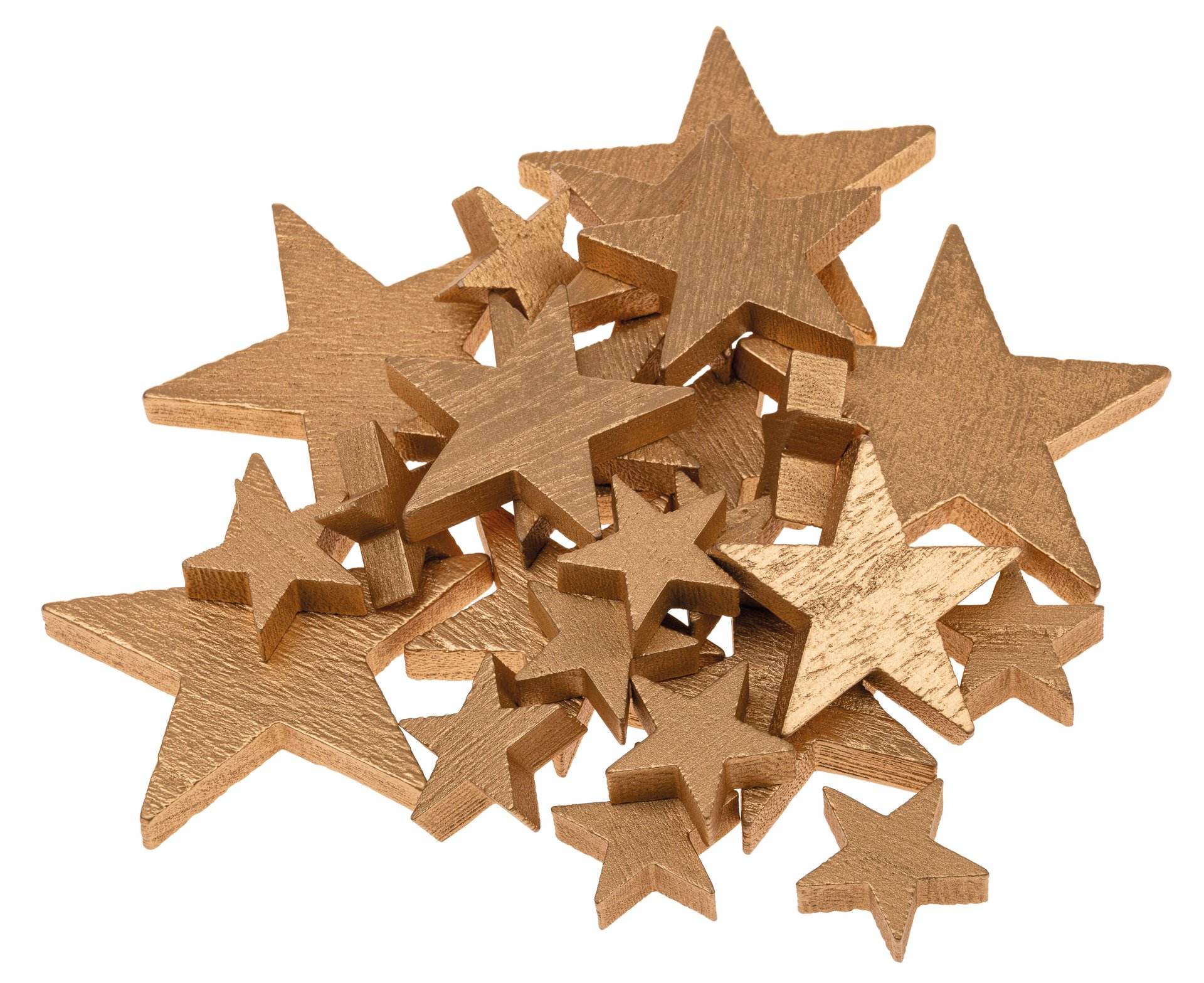 Sterne aus Holz in unterschiedlichen Größen – ideal zum Dekorieren. 3fach sortiert. 24 Stück im Beutel.