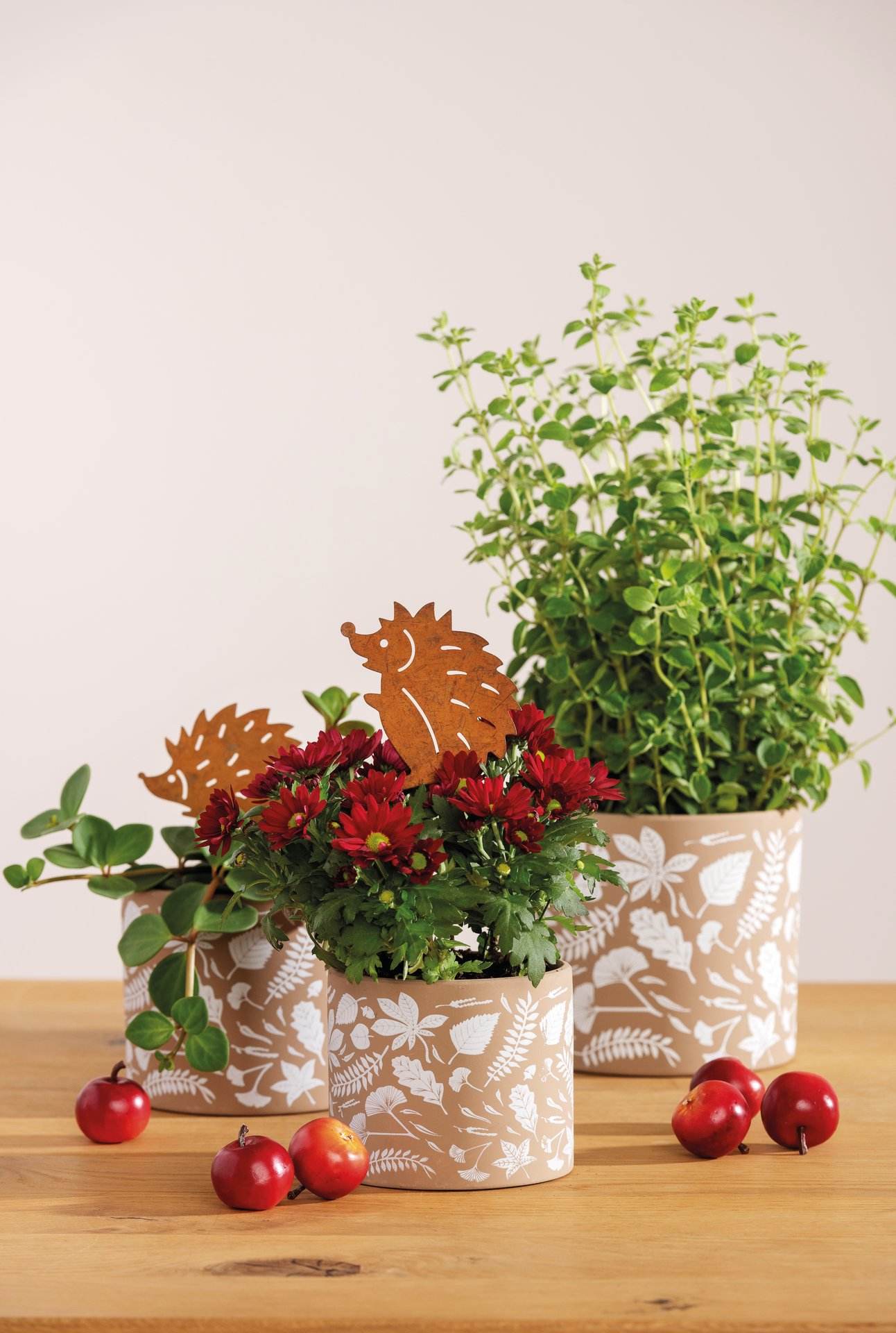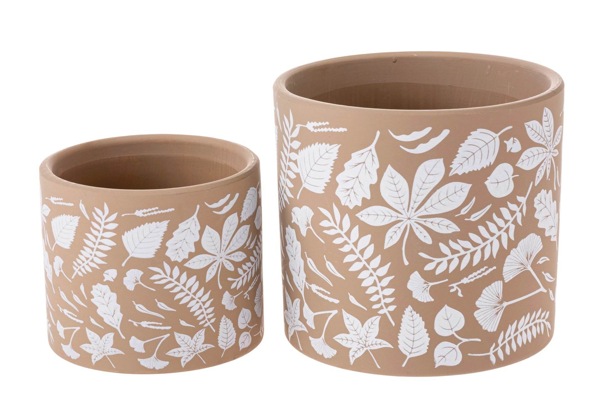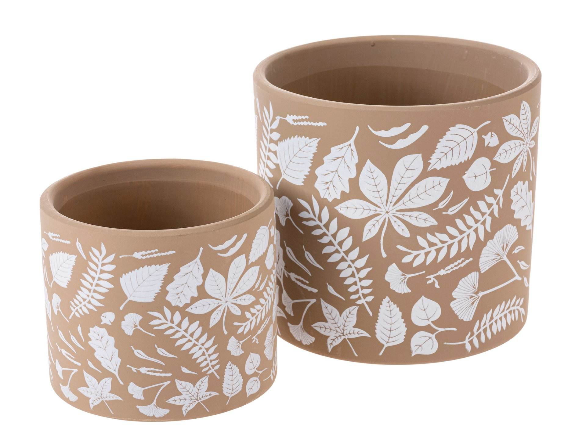 Pflanztopf aus Terrakotta mit weißem Blättermuster. 2er-Set. Größen: Ø 10,5 x 9 cm / Ø 13,5 x 12,5 cm.