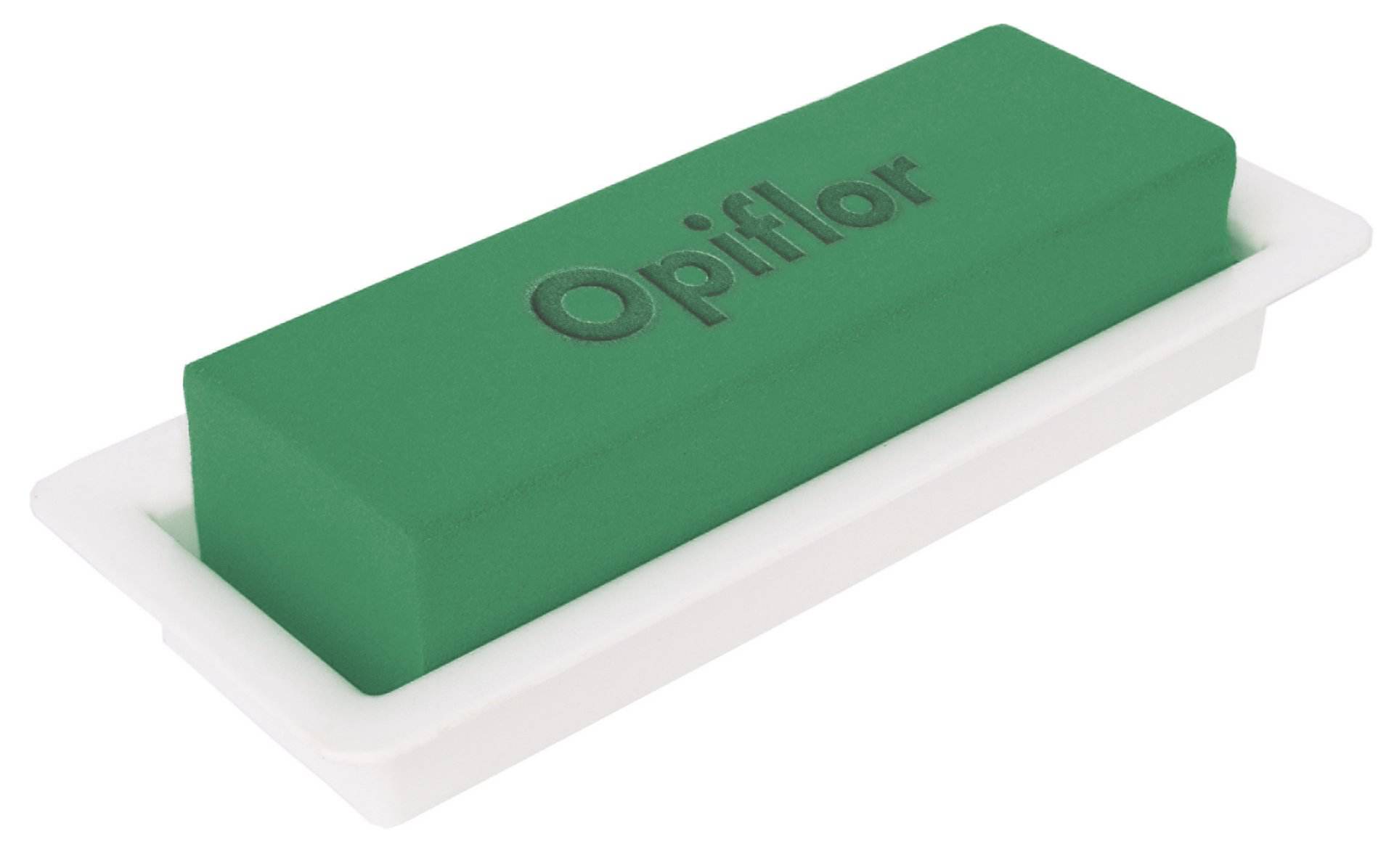 Nass-Steckschaum in wasserdichter, weißer Kunststoffschale mit praktischem Gießrand. Schalenrand: ca. 1,5 cm breit.