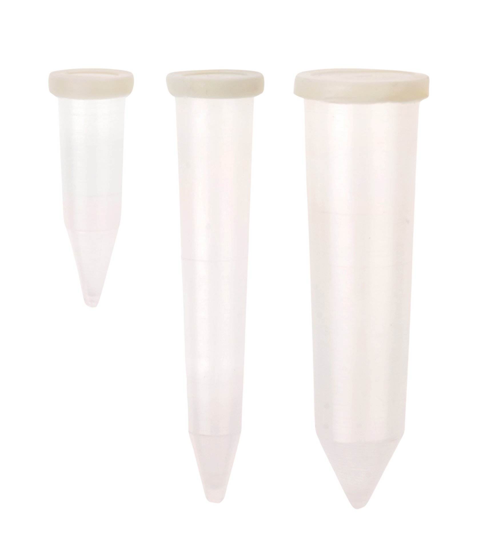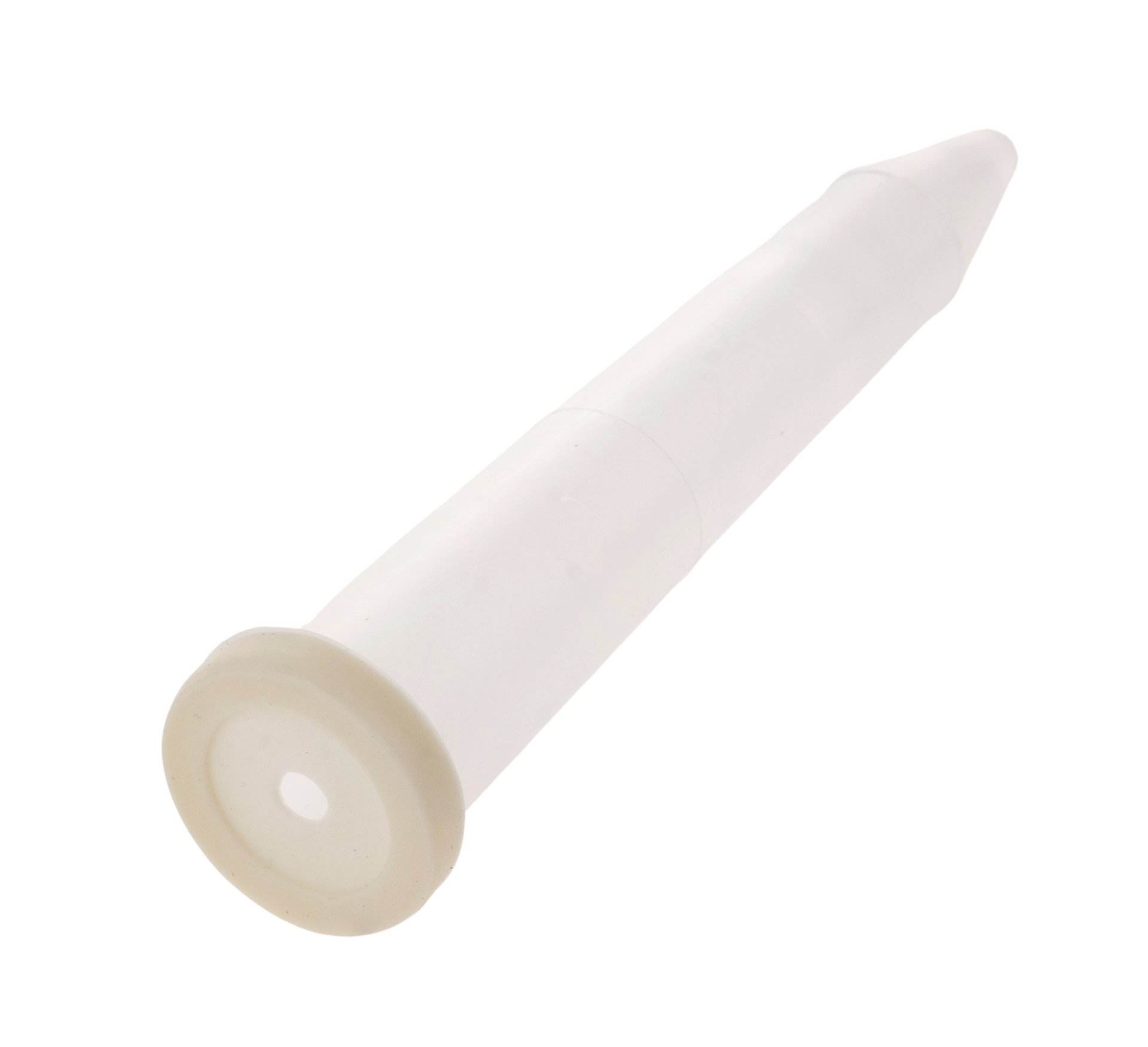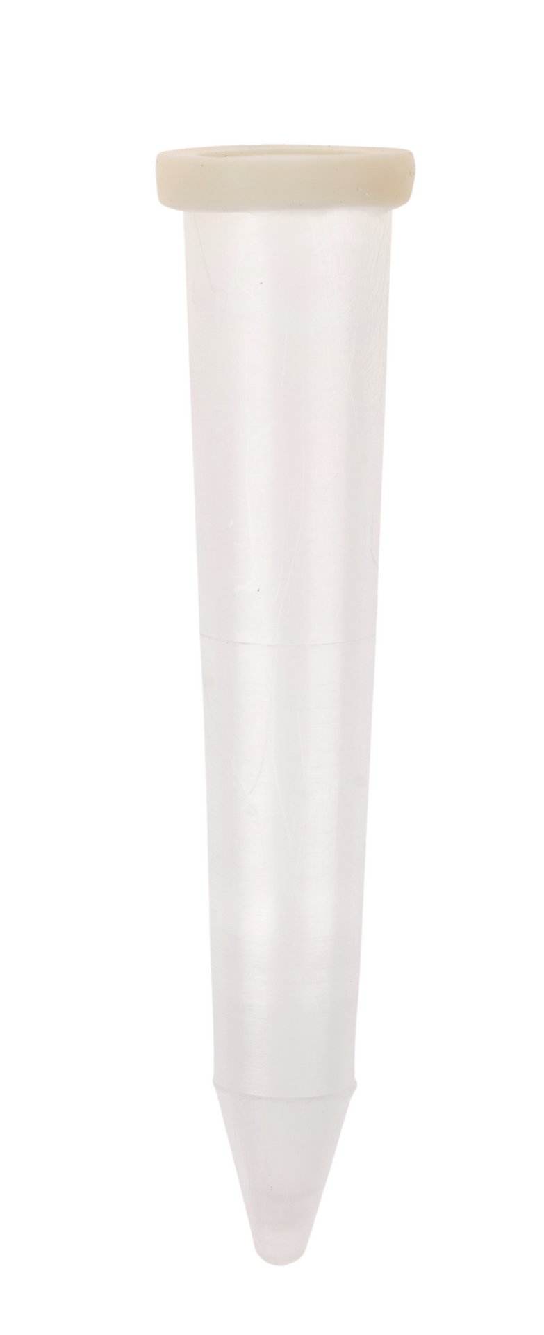 Transportvase aus Kunststoff mit Gummideckel für einzelne Blumen.