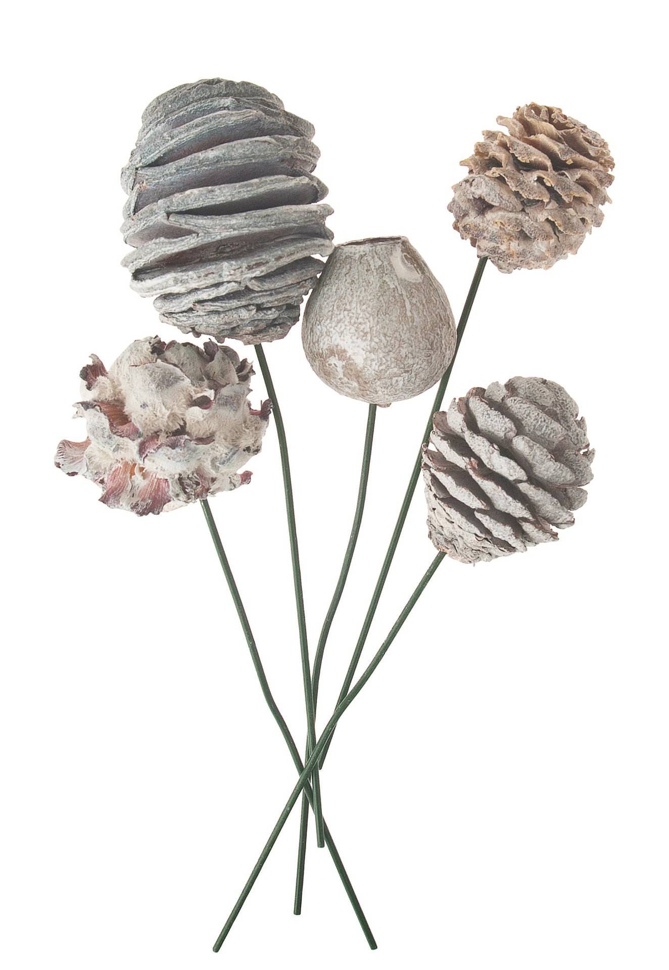 Gemischte Leucodendronköpfe am Draht, in einer Box.Größe: ca. Ø 3 - 4 cm, Drahtpick ca. 9 cm.