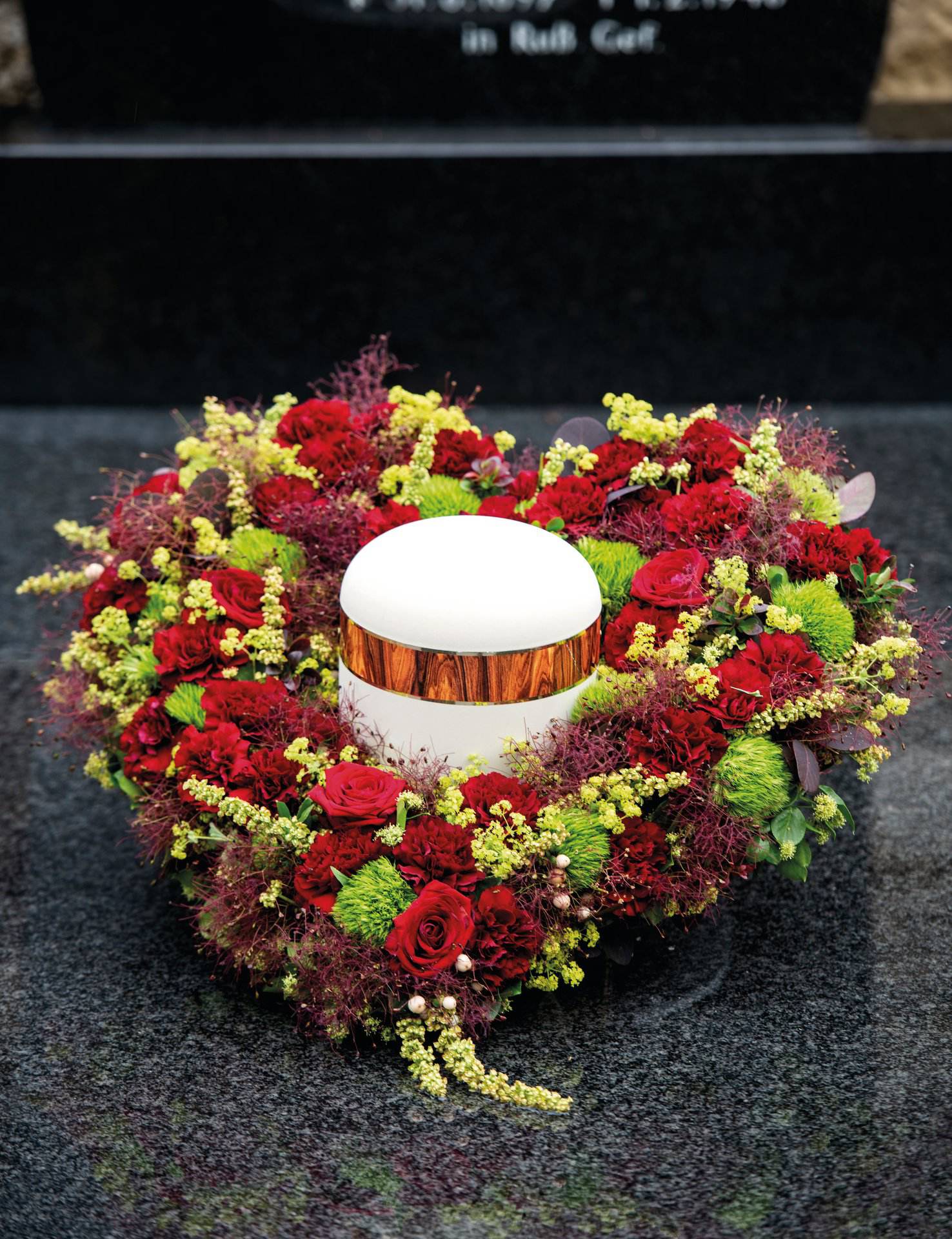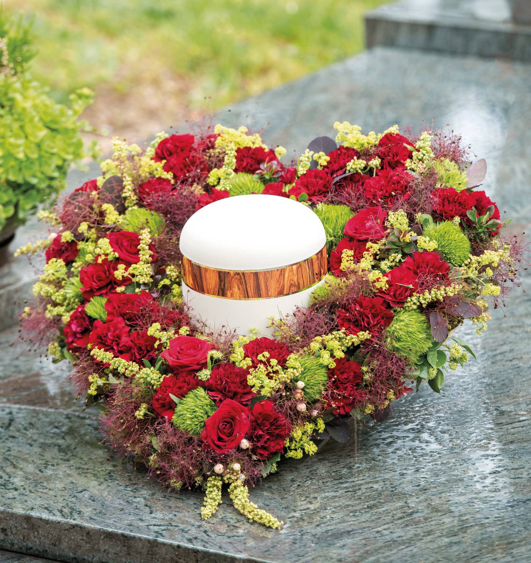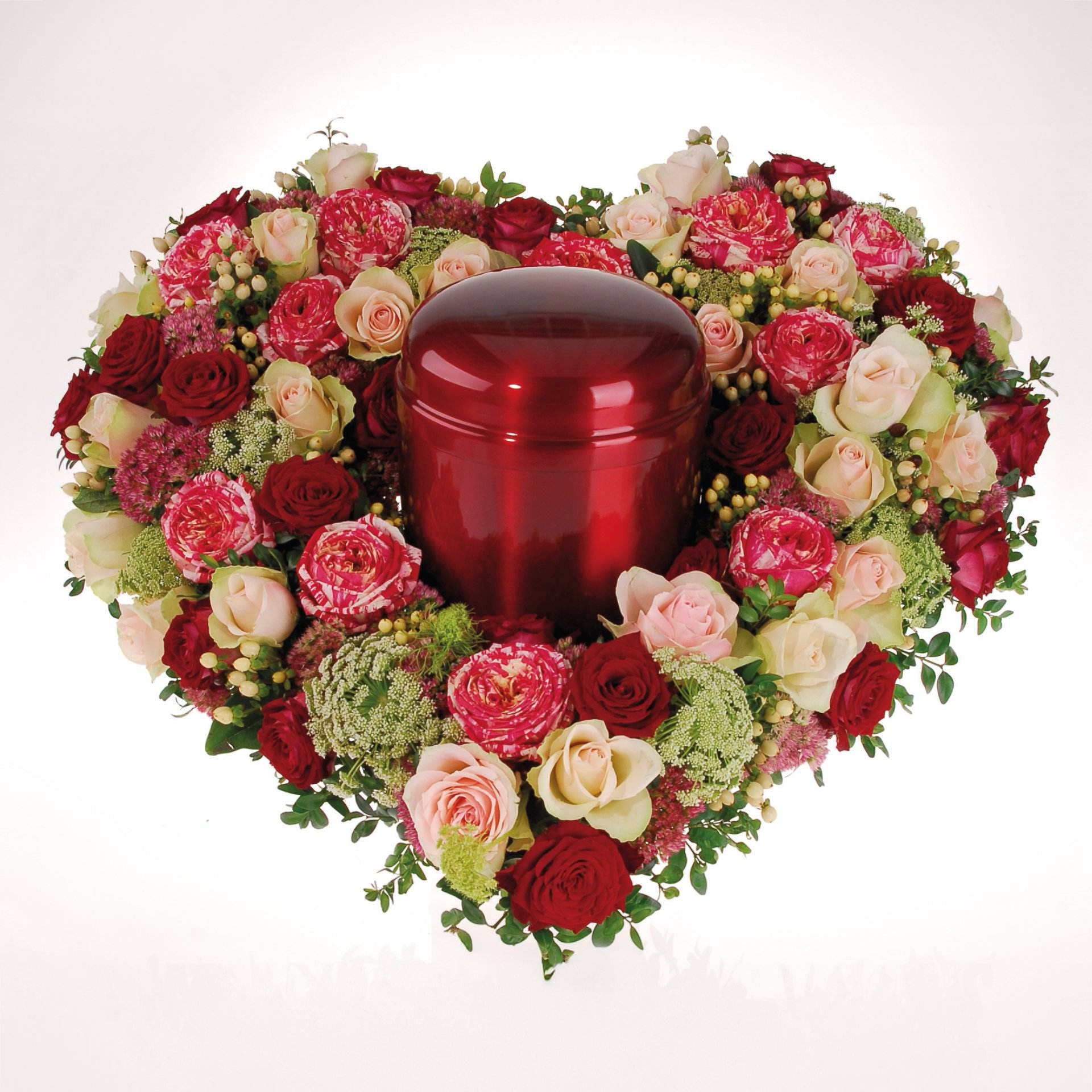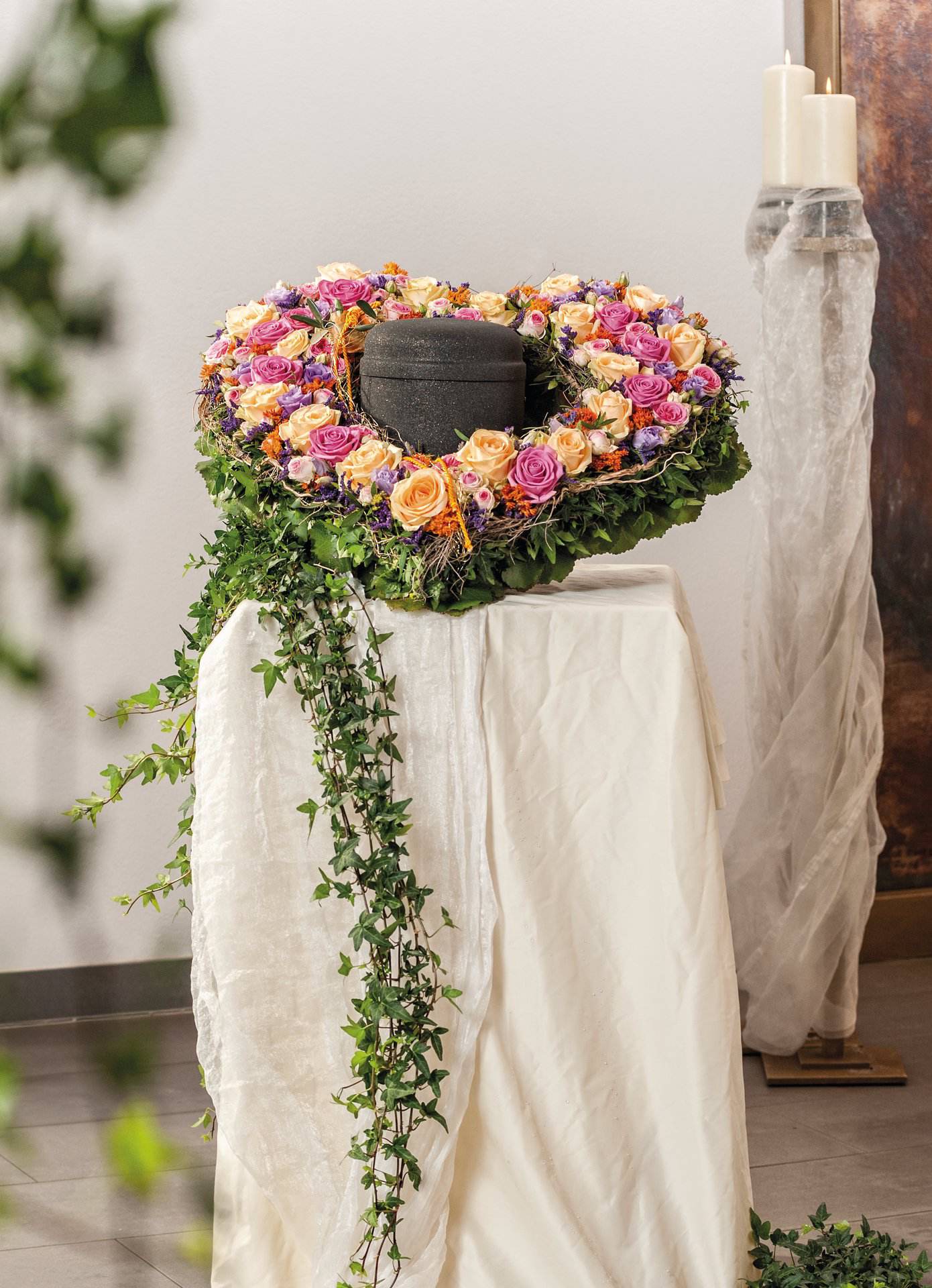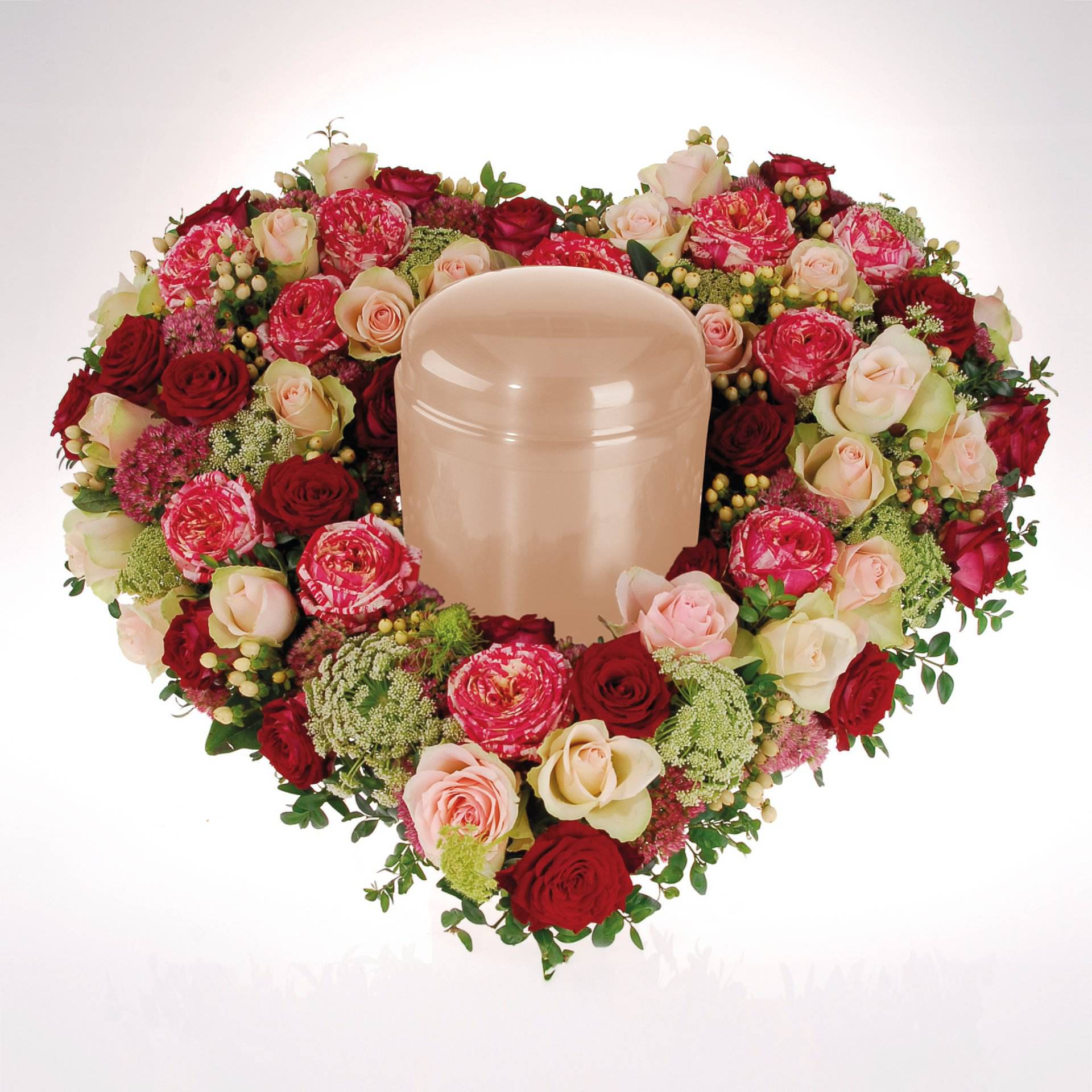 Nass-Steckschaumherz mit Drainage und stabiler Holzunterlage, zum Stellen. Die Urne steht auf einem stabilen Holzpodest.