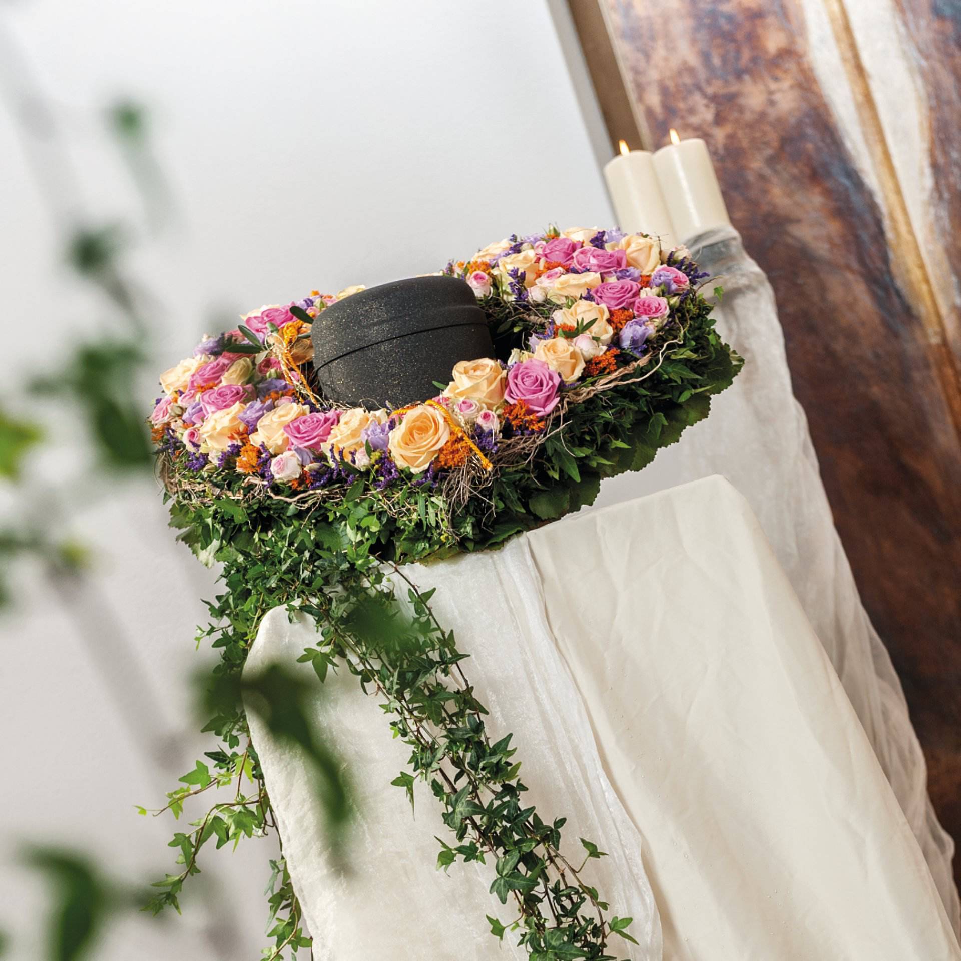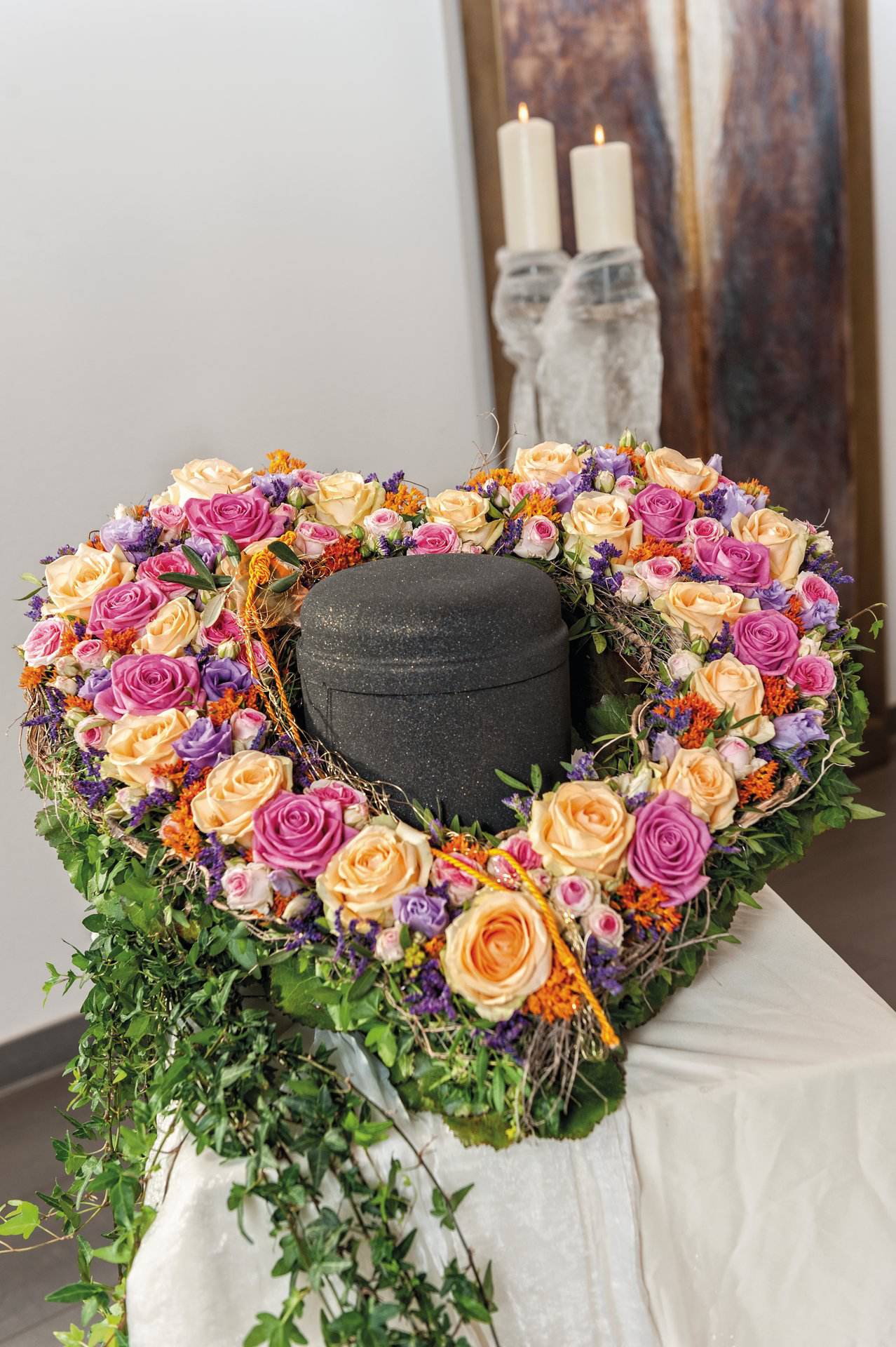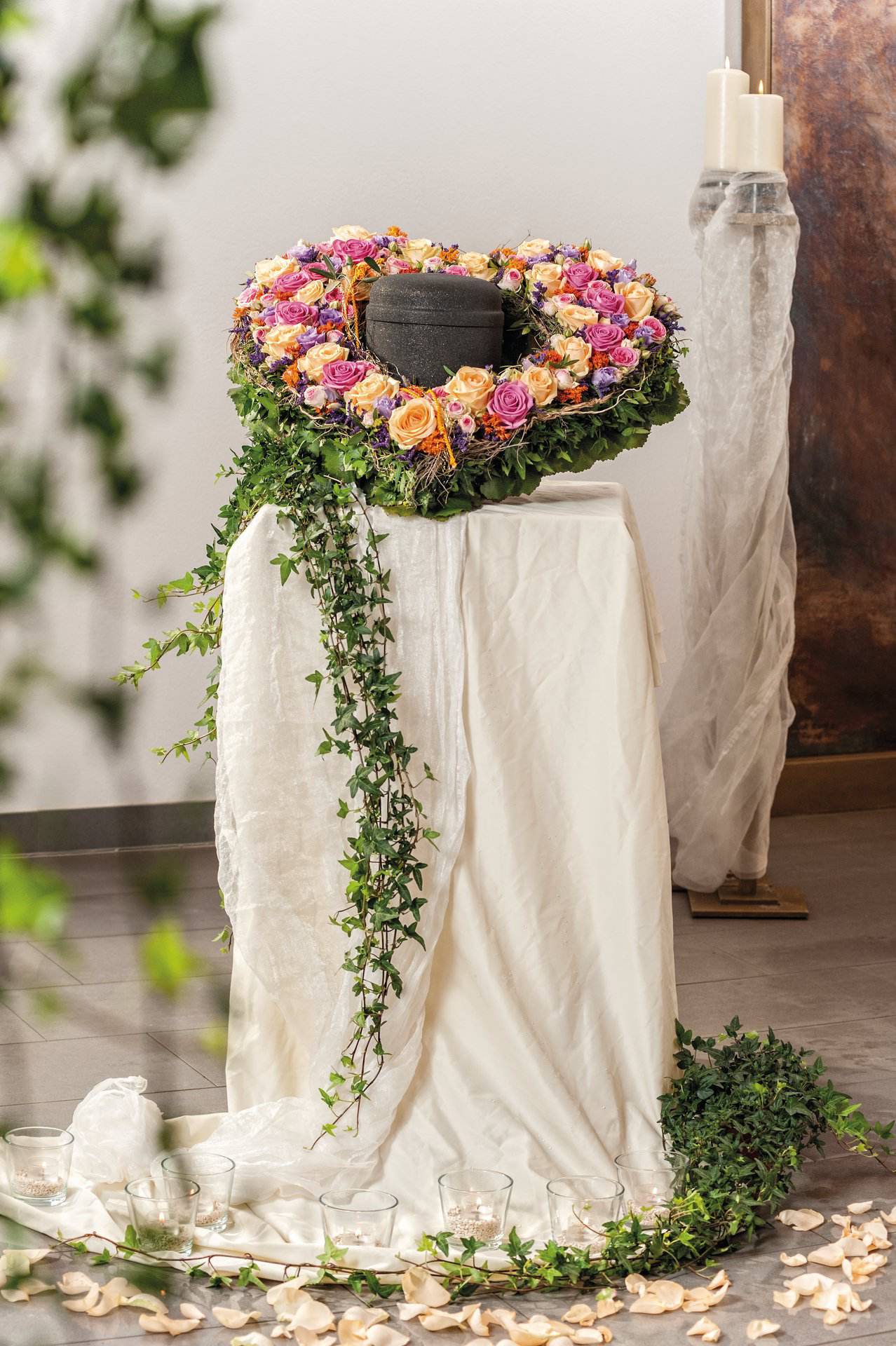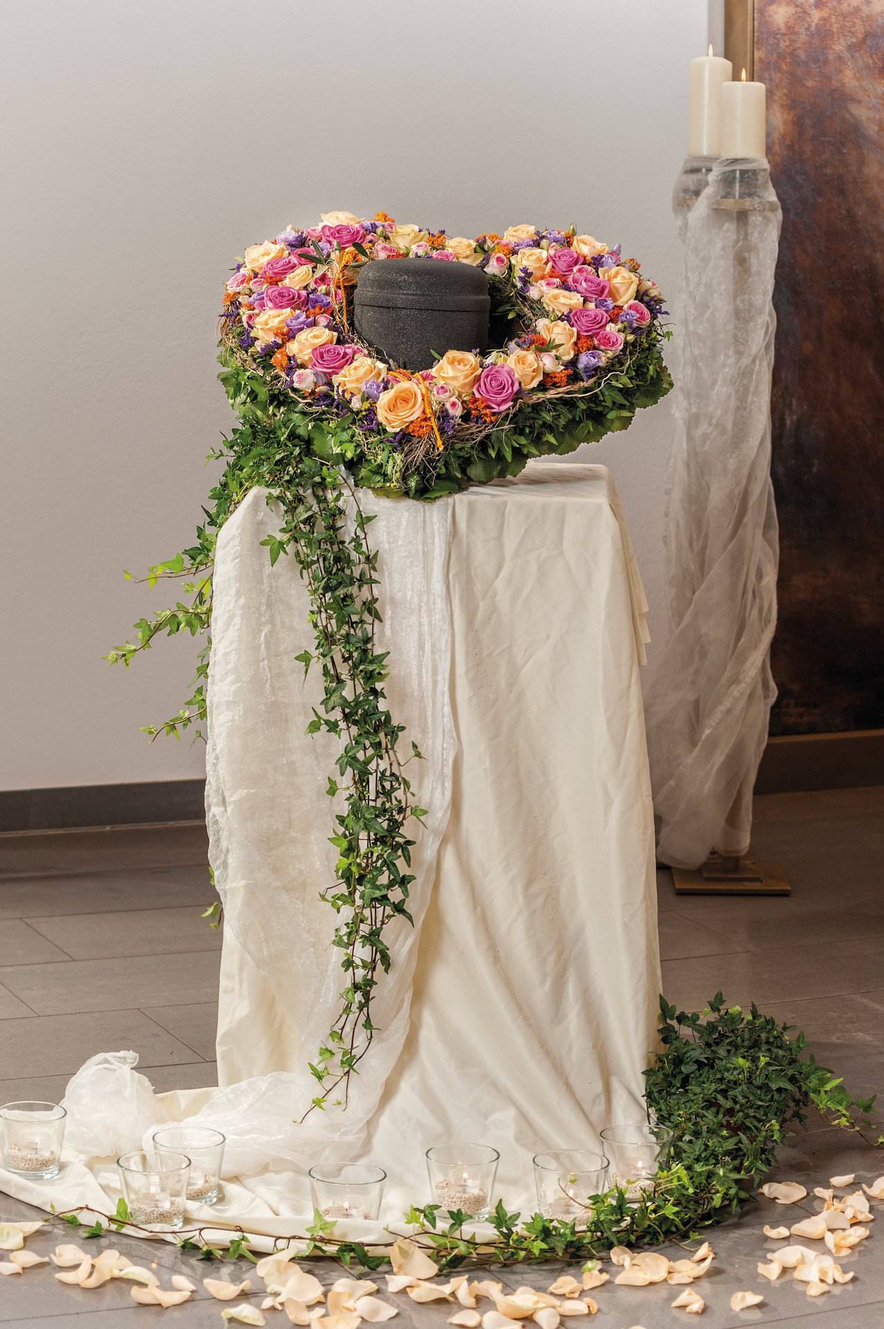 Nass-Steckschaumherz mit Drainage und stabiler Holzunterlage, zum Stellen. Die Urne steht auf einem stabilen Holzpodest.