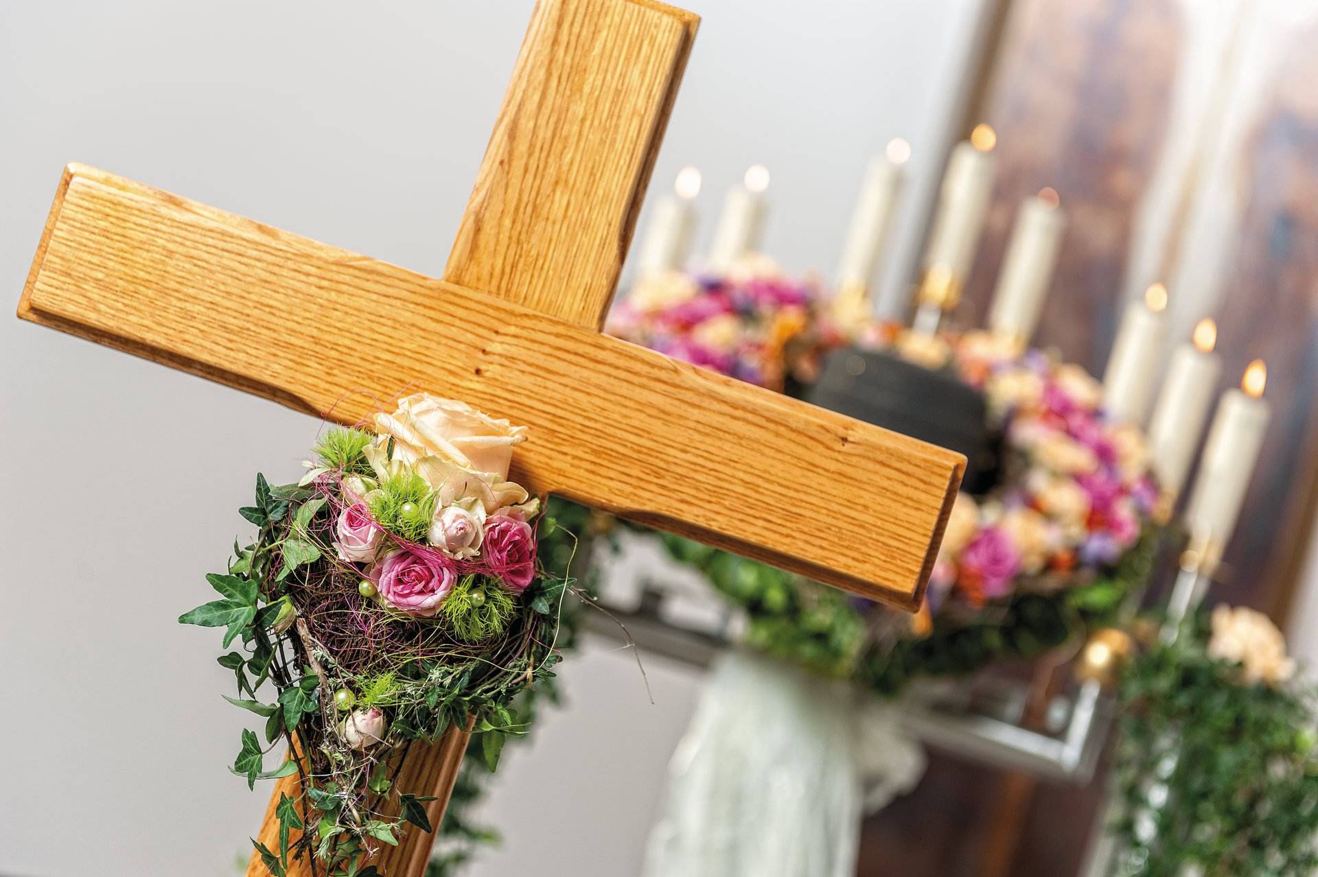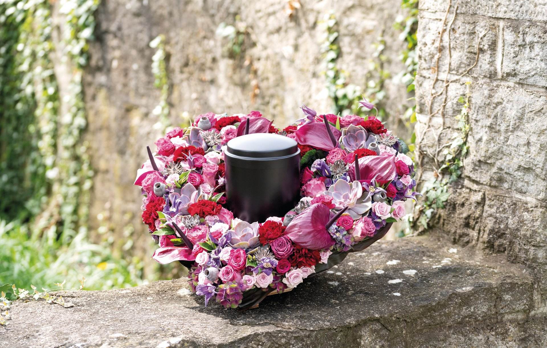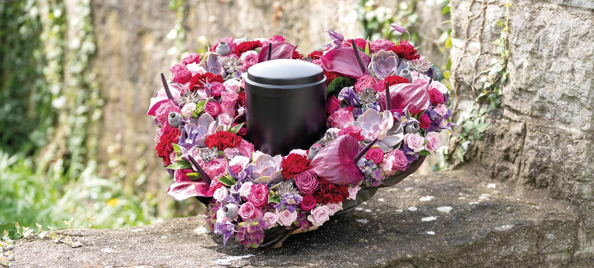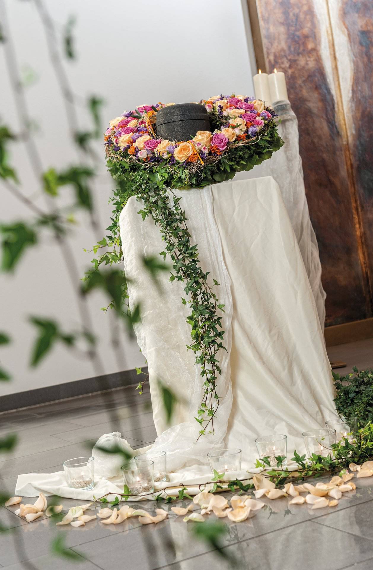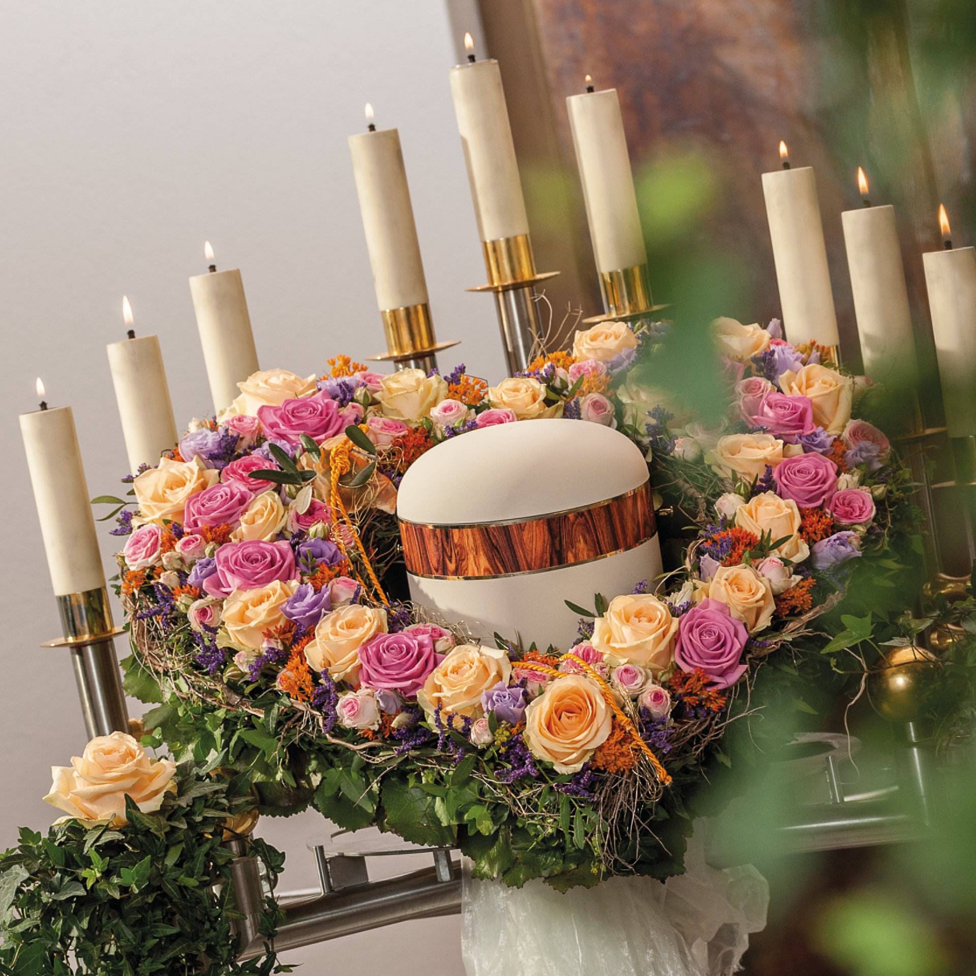 Nass-Steckschaumherz mit Drainage und stabiler Holzunterlage, zum Stellen. Die Urne steht auf einem stabilen Holzpodest.
