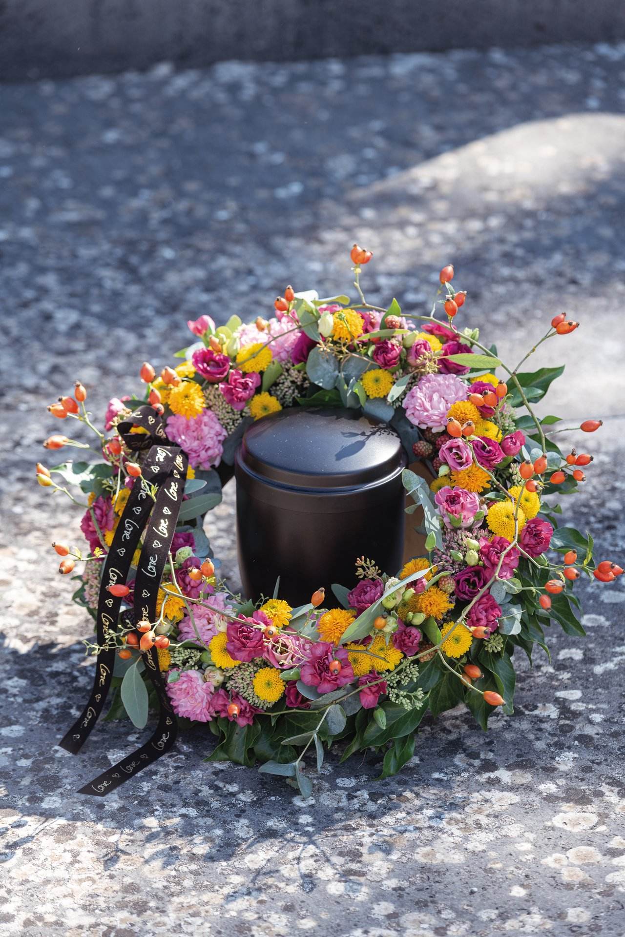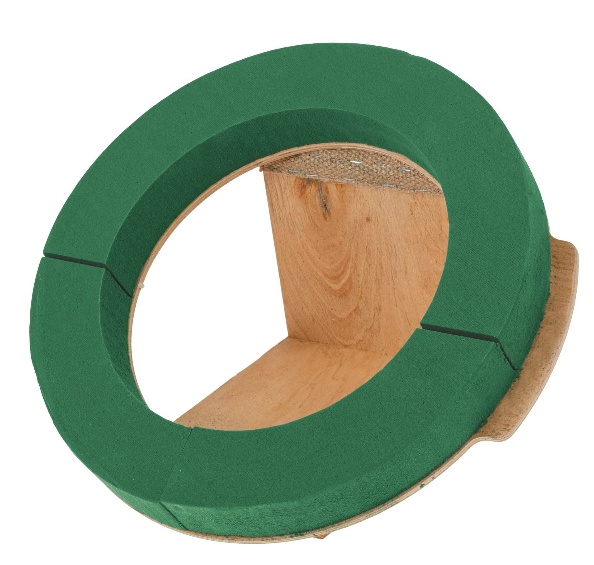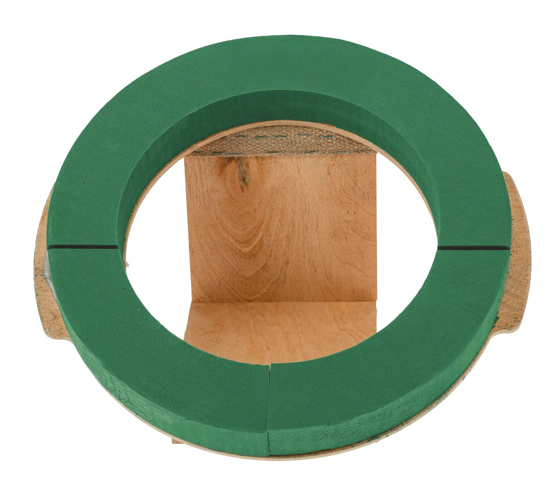 Nass-Steckschaumkranz mit Drainage und stabiler Holzunterlage zum Stellen. Die Urne steht auf einem stabilen Holzpodest. Geeignet für kleine Urnen. Innenmaße: Ø 24,5 cm.