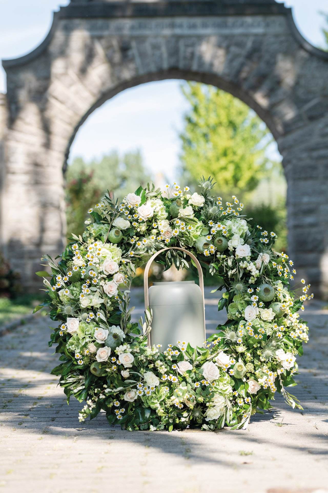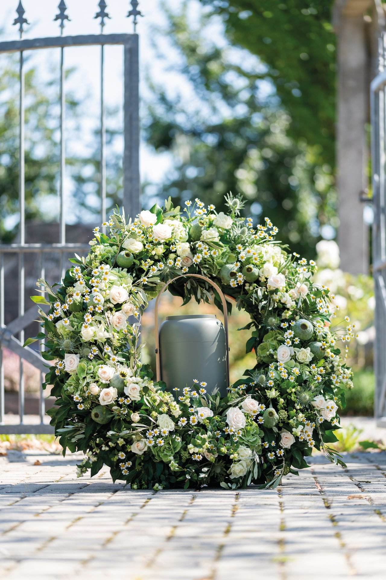 Nass-Steckschaumkranz zum Stellen mit stabiler Holzunterlage und Podest für die Urne. Innenmaße: Ø 37 cm.
