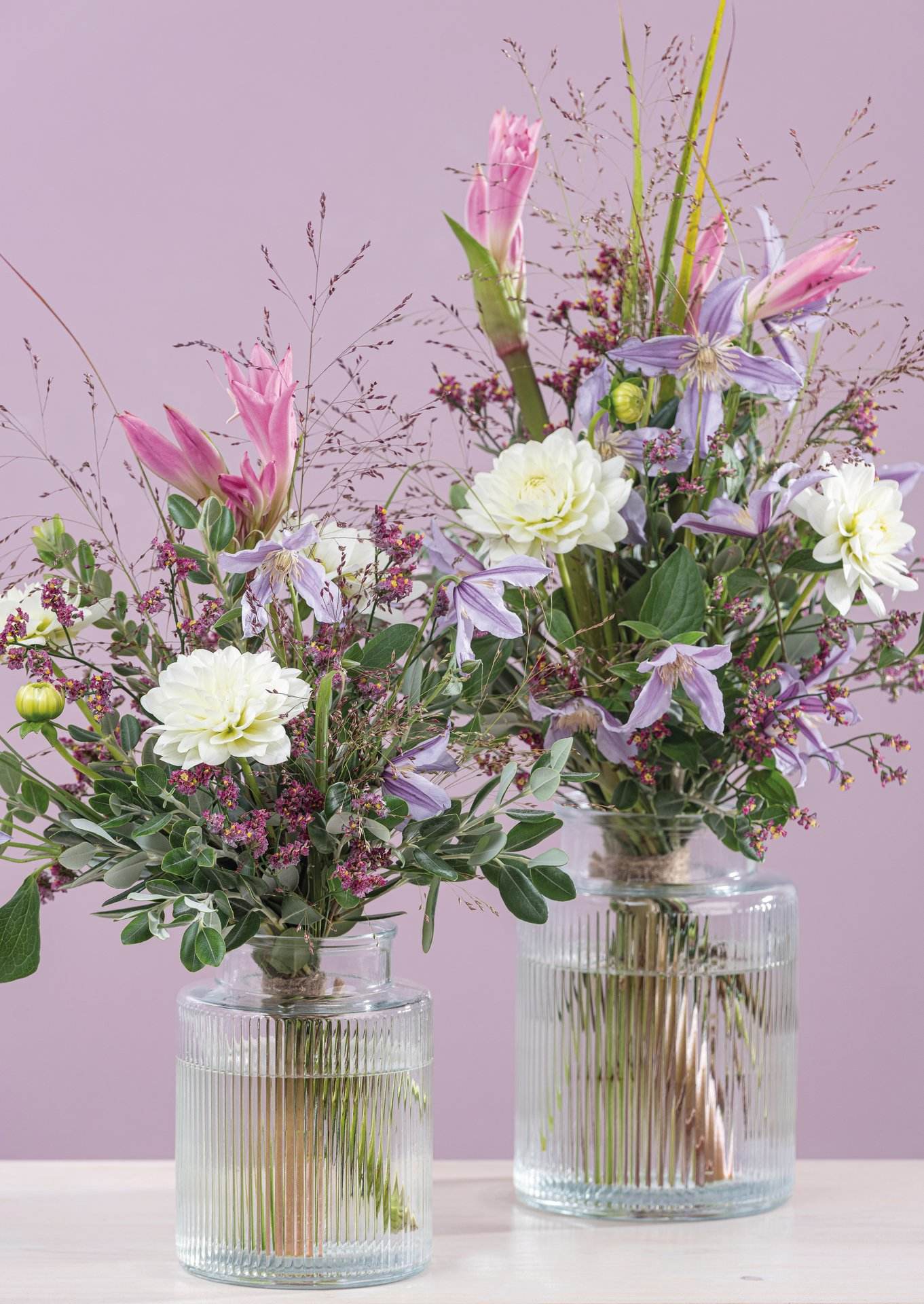 Vase en verre rainuré à col étroit. Dimensions des ouvertures : 8 cm et 9,5 cm.