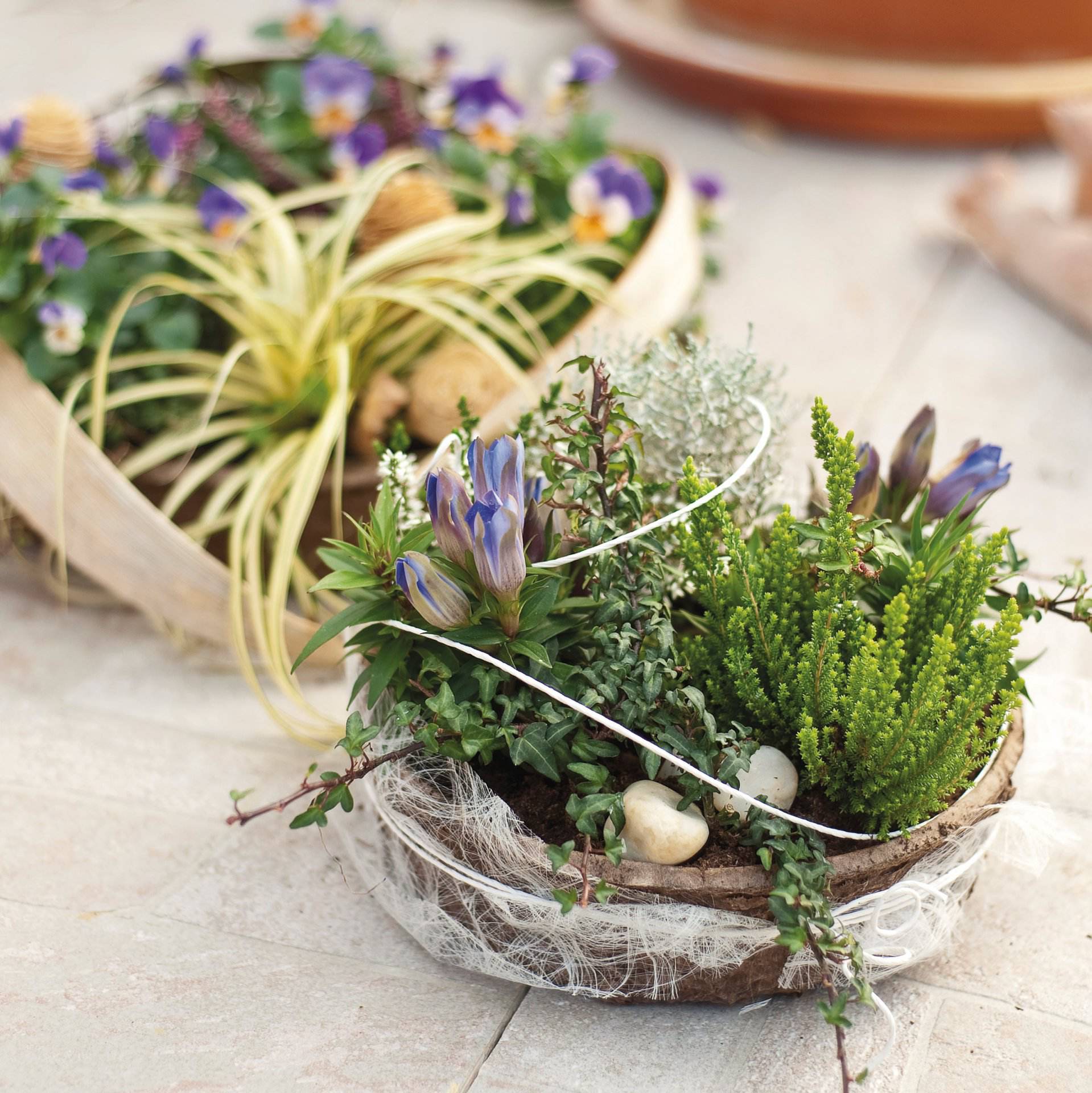 Pflanzring aus weiß gekalkter Rinde. Innen foliert. 2er Set. Größen: Ø 39 x 9 cm, Ø 45 x 10 cm. Innendurchmesser der beiden Körbe: 14cm , 18,5cm.