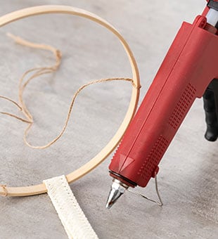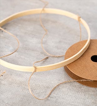 1. Bringen Sie an mindestens drei Punkten am Kranzreifen eine Befestigung zum Aufhängen an. Hängen Sie den Kranz zum weiteren Arbeiten anschließend auf.