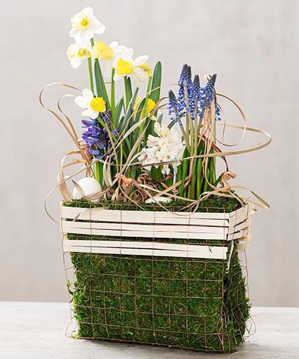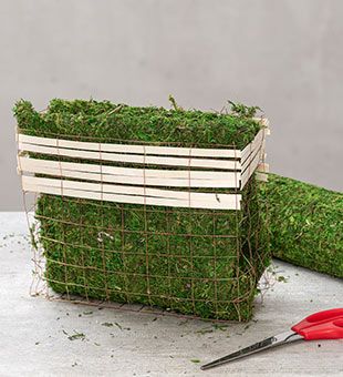 3. Mit der Moosmatte legen Sie Ihren Drahtkorb aus. Bevor Sie ihn mit Pflanzen bestücken, sollten Sie ein Stück Folie hineinlegen, um das Auslaufen des Wassers zu vermeiden. Jetzt können Sie mit dem Bepflanzen und Dekorieren beginnen.