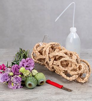 3. Ziehen Sie Ihre geflochtenen Bastzöpfe durch die Öffnungen des Gitterdrahtes und stecken Sie die Glasröhrchen dazwischen.