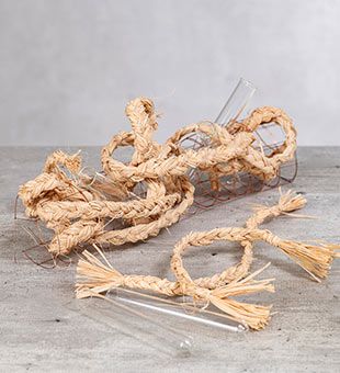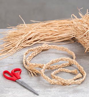 1. Bündeln Sie mehrere Baststreifen und flechten Sie sich daraus Zöpfe.